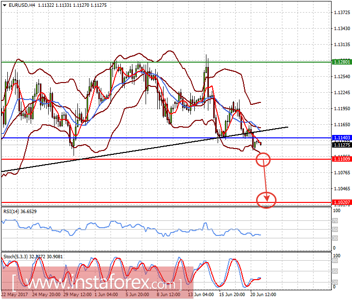 Пара EURUSD упала ниже уровня поддержки 1.1140. Мы по-прежнему считаем, что она будет и далее снижаться. После снижения ниже 1.1140 есть вероятность ее падения к 1.1000, а затем уже и к 1.1020.