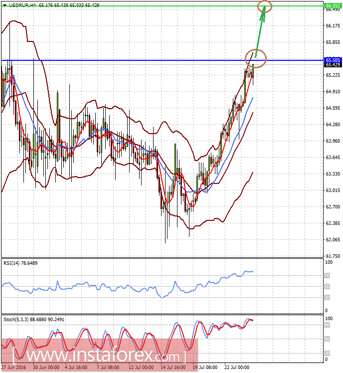 Российский рубль возобновил корреляцию с котировками цен на сырую нефть и продолжает антиралли на фоне ситуации на нефтяном рынке и после заявлений В. Путина и других высокопоставленных чиновников РФ о том, что рубль переоценен. Мы ожидаем, что после пробития отметки в 65.50 пара устремится к 66.50.