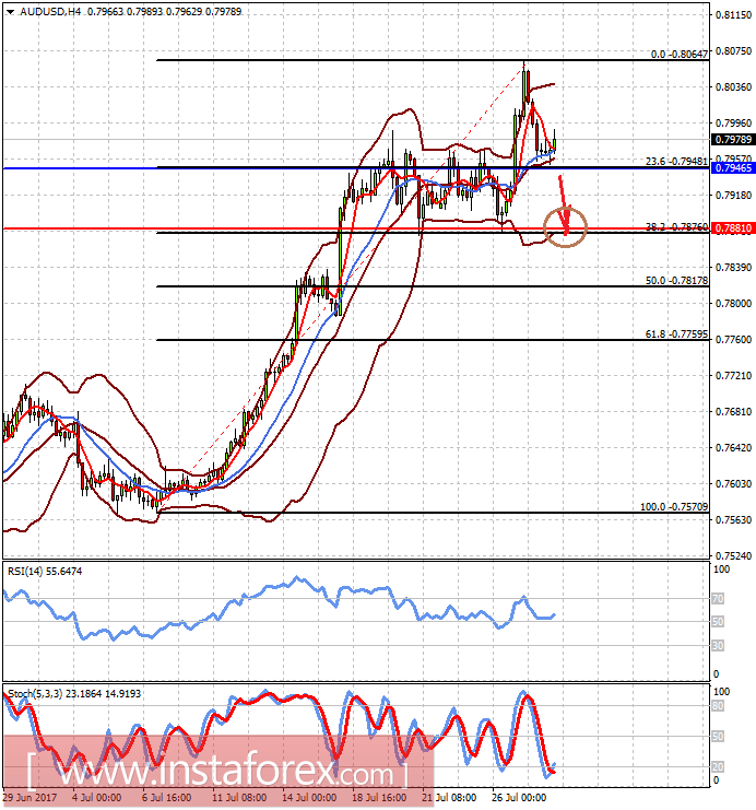 Пара AUDUSD торгуется выше уровня 0.7945. Она может возобновить коррекционное снижение на фоне позитивных данных из Штатов, а также прорыва отметки 0.7945. В этом случае цена, вполне вероятно, упадет к 0.7880.