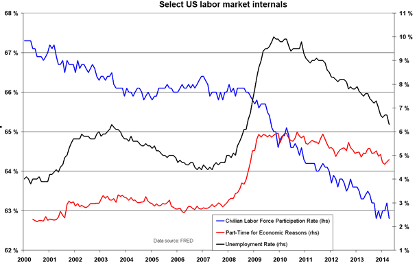 После значительного подъема в апреле незначительное ухудшение показателя на изменит мнения на рынке о том, что экономика восстанавливается и положение на рынке труда медленно улучшается. Даже беглого взгляда на развивающиеся тенденции достаточно, чтобы понять, что уровень безработицы стремится вниз, а темпы роста занятости, хотя и сильно колеблются от месяца к месяцу, в среднем составляли 186 000 рабочих мест с начала 2011 года. Если рост полной занятости и снижение процента людей, занятых частично по экономическим причинам, укрепляет оптимизм, то сохраняющийся нисходящий тренд по показателю доли экономически активного населения и отсутствие роста доходов вызывает тревогу: как показали самые последние данные, средняя заработная плата растет всего на 1,9% в годовом исчислении. Поэтому несмотря на то что безработица снижается, качество рабочих мест ухудшается, и люди продолжают покидать рынок труда, уменьшая тем самым инфляционное давление.