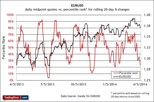 Часть такого разворота обусловлена естественным эффектом финансовой силы тяжести. Как видно из приведенного ниже графика, достижение вершины в паре евро/доллар на уровне 1,39 совпало с краткосрочным ценовым движением, которое оказалось достаточно сильным в плане процентильного ранга для пролонгирующейся 20-дневной доходности. «Мы по-прежнему считаем, что ЕЦБ идет на необоснованный риск, медленно реагируя на низкую инфляцию, и ожидаем, что до конца года будут приняты нетрадиционные меры в области денежно-кредитной политики» — заявили аналитики Barclays Capital в аналитической заметке в конце прошлой недели. Валютный рынок, похоже, согласен с такой точкой зрения, о чем свидетельствует недавние падение курса евро/доллара. Нисходящее давление усилилось в пятницу на фоне благоприятных новостей о занятости в США за март. Некоторые участники рынка посчитали, что это означает ускорение темпов экономического роста в США этой весной и, как следствие, улучшение перспектив американского доллара.