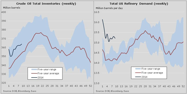 Восходящая тенденция была прервана еженедельным отчетом о запасах в США, который показал, что запасы нефти увеличились седьмую неделю подряд, в то время как спрос на НПЗ, наконец, начал замедляться. Из-за холодов НПЗ поддерживали производство, а значит, и спрос на уровне выше нормы, так как запасы дистиллятов, например мазута, истощились. Теперь с наступлением весны заводы смогут, наконец, провести ежегодный переход на летний режим производства бензина. В этот период спрос на сырую нефть обычно падает, а запасы растут, если только одновременно с этим не замедляется импорт.