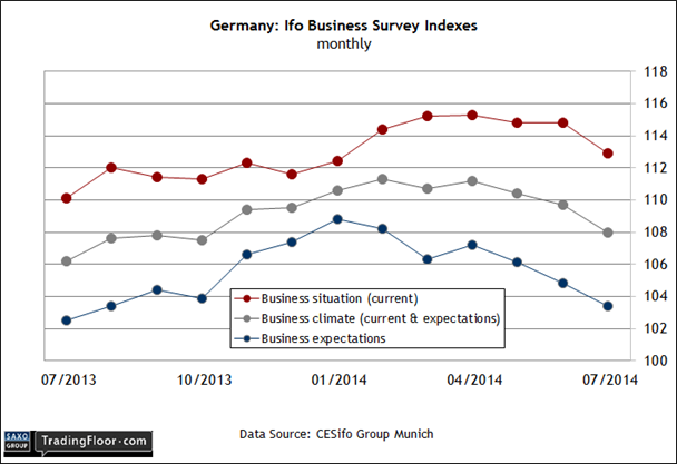 На рынках уже не один месяц бытует мнение о том, что экономика Германии уязвима, и слабые индикаторы Ifo это подтверждают. Наиболее слабым является индикатор ожиданий - он снижается большую часть 2014 года. В июле этот показатель упал до 11-месячных минимумов в области 103,4. Свежие новости из других источников не дают повода для оптимизма в отношении сегодняшнего отчета. Опубликованный на прошлой неделе предварительный композитный индекс менеджеров по закупкам в Германии за август снизился до 54,9, что свидетельствует об умеренном росте экономической активности. Однако ВВП во втором квартале снизился, поэтому большинство людей уверены в том, что "эффект Путина" и далее будет негативно влиять на немецкую экономику.