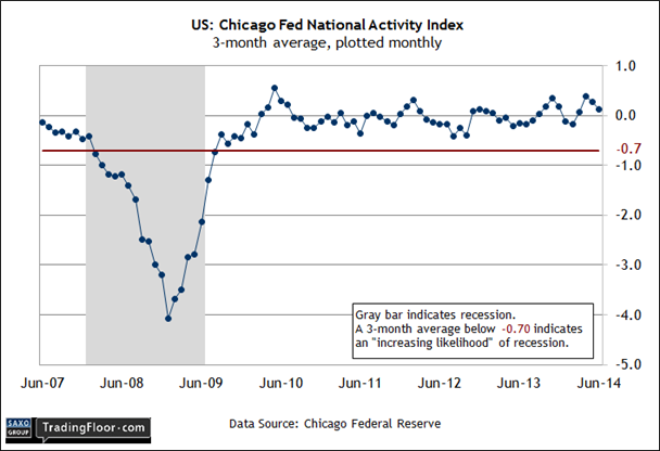 Сегодняшний индекс ФРБ Чикаго подтвердит восходящую динамику американской экономики. Несмотря на то, что моя эконометрическая модель подразумевает незначительное снижение трехмесячной скользящей средней индекса деловой активности в июле по сравнению с предыдущим месяцем, в целом, этот индикатор бизнес-цикла сохранит положительное значение (выше нуля), что свидетельствует о темпах экономического роста выше среднего.