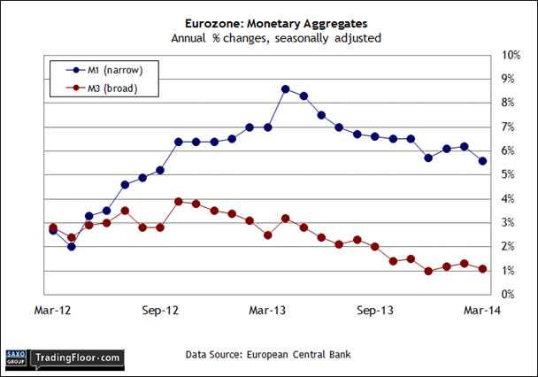 Похоже, что ЕЦБ подготавливает почву для объявления о более масштабной программе денежного стимулирования. Все может быть, однако имеющиеся на сегодняшний день данные о денежных агрегатах свидетельствуют о том, что экономия все еще доминирует над стимулами. Узкий индикатор денежной массы (M1) в марте понизился до минимальных темпов годового роста (5,6%) с сентября 2012 года. Динамика широкого индикатора (M3) немного ускорилась в последнее время, но в целом можно с уверенностью сказать, что темпы роста денежной ликвидности в Еврозоне снижаются.