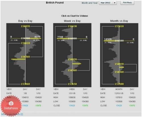 Показатели распределения объемов (Volume Price): В данное время цена находится на границе 1,5470 (Daily pivot) и ниже значений 1,5600 (Weekly pivot), 1,5658 (Monthly pivot) – медвежье флетовое расположение цены, медвежье трендовое расположение объемов.