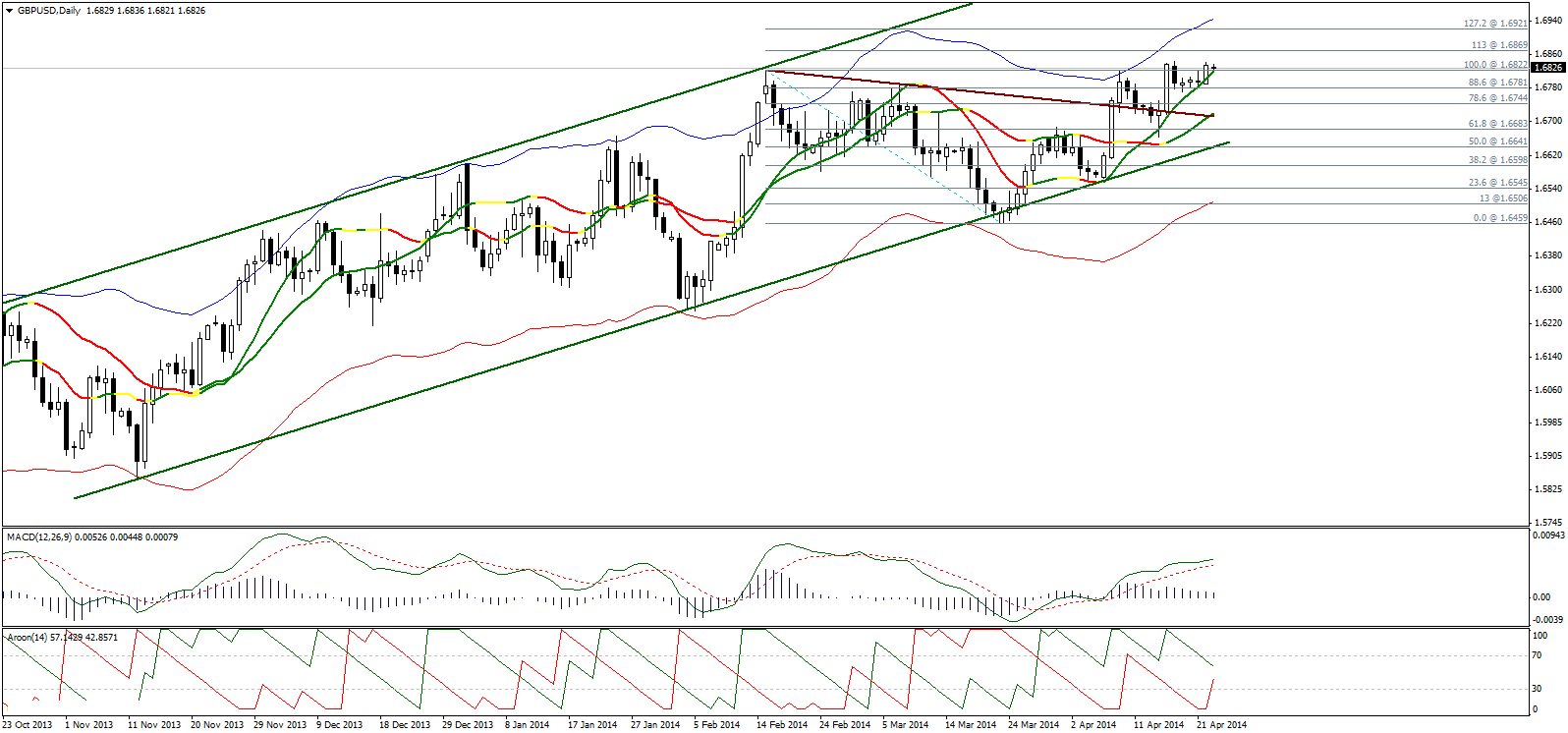 В настоящее время пара стабильна выше линии Линейной регрессии и выше уровня 1,6820, что является положительным фактором и может привести к росту. Наш бычий сценарий зависит от уровня 1,6780, пробой которого приведет к резкому снижению.