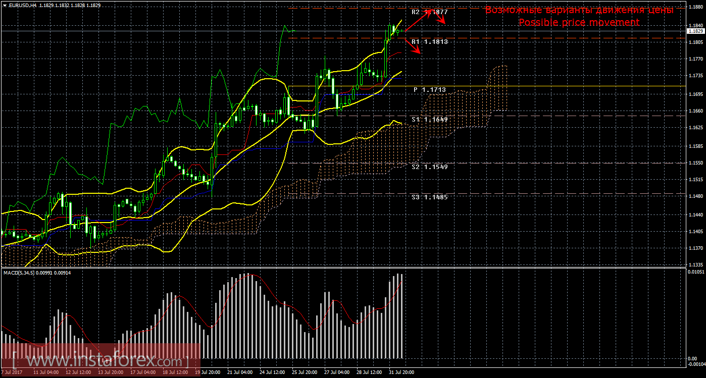 Анализ рынка Форекс по паре евро/доллар за 1 августа показывает, что цена продолжает формирование восходящего тренда и преодолела первый таргет 1,1813. Текущий сигнал на покупку остается подтвержденным и сильным, так как Чинкоу Спан находится выше графика цены, а цена располагается выше облака Ишимоку. На данный момент целью для восходящего движения является второй уровень сопротивления 1,1877. В случае преодоления этой цели, новым таргетом будет выступать уровень сопротивления 1,1977. Восходящее движение является актуальным до тех пор, пока цена находится выше линии Киджун-сен (1,1730). Если цена уйдет ниже критической линии, то «золотой крест» будет ослаблен, восходящее движение – будет временно отменено, движение вниз сможет продолжиться с целью уровень поддержки 1,1649, а ордера на покупку потеряют свою актуальность. Боллинджер Бандс показывает продолжение восходящего движения, полосы расширяются и направлены наверх, поэтому сейчас на рынке рекомендуется рассматривать варианты длинных позиций. MACD направлен вверх, что свидетельствует о восходящем движении, разворот индикатора вниз просигнализирует о витке коррекции. Индикатор может начать разряжаться в любой момент, так как находится на своих максимальных значениях. Волатильность по паре EUR/USD выросла до 122 пунктов, что является высоким показателем для инструмента, общая дистанция минувшего дня составила 180 пунктов. Отскок от уровня 1,1877 может спровоцировать коррекционное движение.