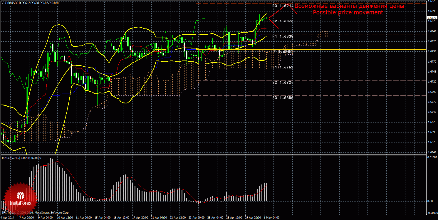 Валютный курс фунта 1 мая продолжает отрабатывать «золотой крест» и закрепилась выше первого уровня сопротивления, возобновив восходящий тренд. Текущий сигнал на покупку – подтвержденный и сильный, так как Чинкоу Спан закрепился выше графика цены, а цена располагается выше облака Ишимоку. На данный момент целью восходящего движения является второй уровень сопротивления 1,6876, который уже достигнут. В случае преодоления этого таргета, восходящее движение может продолжиться с целью третий уровень сопротивления 1,6914. Восходящее движение сохраняется до тех пор, пока цена находится выше Киджун-сен(1,6840), если цена закрепится ниже критической линии, то сигнал на покупку будет ослаблен и поставлен на грань отмены, длинные позиции потеряют свою актуальность, а нисходящее движение может попытаться продолжиться с целью пивот уровень 1,6800. Чинкоу Спан находится выше графика цены, что является подтверждением текущему сигналу на покупку и означает бычье настроение валютных трейдеров по этой валютной паре. Боллинджер Бандс показывает продолжение восходящего движения, полосы расширяются и направлены вверх, поэтому сейчас на рынке актуальны длинные позиции. MACD направлен вверх, что сигнализирует сейчас о текущем восходящем движении цены, если индикатор развернется вниз, это может засвидетельствовать виток нисходящей коррекции. Отскок цены от уровня 1,6876 также может спровоцировать начало коррекционного движения.