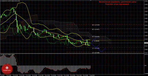 1 августа пара доллар/франк продолжает боковое коррекционное движение, отработала первый уровень поддержки, но продолжить нисходящее движение не смогла. Текущий сигнал на продажу – подтвержденный и сильный, так как Чинкоу Спан находится ниже графика цены, а цена располагается ниже облака Ишимоку. Поэтому сейчас целью для нисходящего движения является первый уровень поддержки 0,9226, который уже отработан. В случае закрепления цены ниже первой цели будет доступен новый таргет для нисходящего движения – второй уровень поддержки 0,9168. Нисходящее движение имеет перспективы до тех пор, пока цена находится ниже Киджун-сен (0,9280), если цена закрепится выше Киджун-сен, то сигнал на продажу ослабится, а дальнейшее нисходящее движение скорее всего отменится, зато может начаться восходящее движение с целью - первый уровень сопротивления 0,9378. Чинкоу Спан находится ниже графика цены, что является подтверждением текущему сигналу на продажу и означает медвежье настроение участников рынка по валютной паре доллар/франк. Боллинджер Бандс показывает боковое движение, полосы сузились и направлены вбок, поэтому на рынке сейчас не актуальны ни ордера на продажу, ни ордера на покупку. MACD направлен вниз, что сигнализирует о нисходящем движении цены и разрешает сейчас рассматривать короткие позиции, если индикатор развернется наверх, это может быть сигналом к началу нового витка коррекции. Отскок от уровня 0,9226 мог спровоцировать восходящую коррекцию.