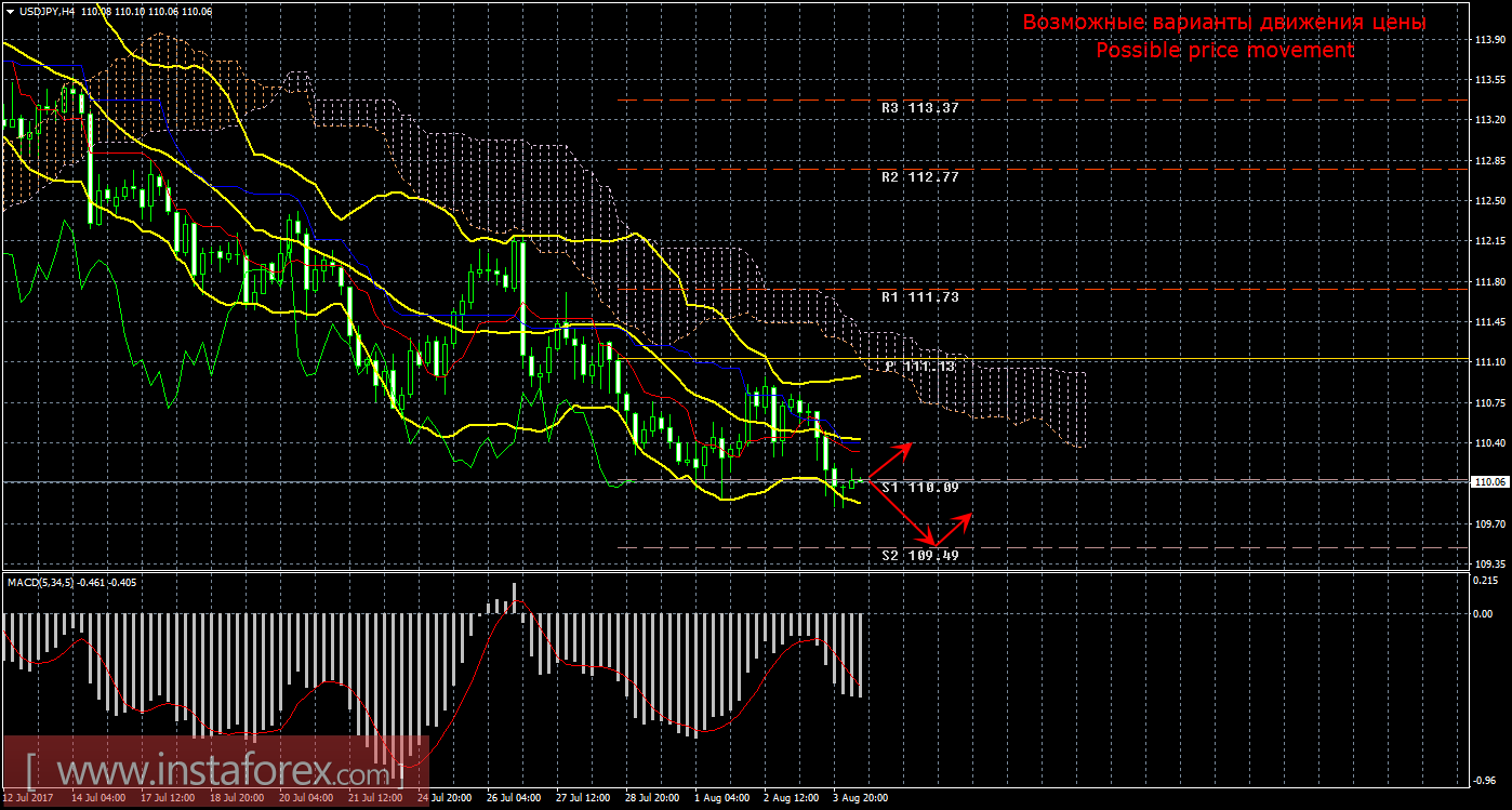 Анализ пары доллар/иена на рынке форекс 4 августа показывает, что цена возобновила движение вниз и отработала первый таргет еще раз. Текущий сигнал на продажу остается подтвержденным и сильным, так как Чинкоу Спан находится ниже графика цены, а цена располагается ниже облака Ишимоку. Поэтому сейчас целью для движения вниз является уровень поддержки 110,09, который уже был достигнут несколько раз. Если этот таргет будет преодолен, то новой целью будет выступать второй уровень поддержки 109,49. Нисходящее движение будет актуально до тех пор, пока цена находится ниже критической линии Киджун-сен (110,40). Если цена вновь уйдет выше этой линии, то «мертвый крест» вновь будет ослаблен, движение вниз – на время станет не актуальными, восходящее движение сможет попытаться продолжиться с целью пивот уровень 111,13, а шорты перестанут быть доступными для открытия. Боллинджер Бандс показывает продолжение нисходящего движения, полосы вновь расширяются и направлены вниз, поэтому сейчас на рынке можно рассматривать короткие позиции. MACD направлен вниз, сигнализируя о текущем нисходящем движении. Разворот индикатора наверх укажет на новый виток коррекционного движения. Амплитуда инструмента вчера составила 97 пунктов, а пройденная дистанция - 165 пункта, что означает среднюю по силе волатильность инструмента.