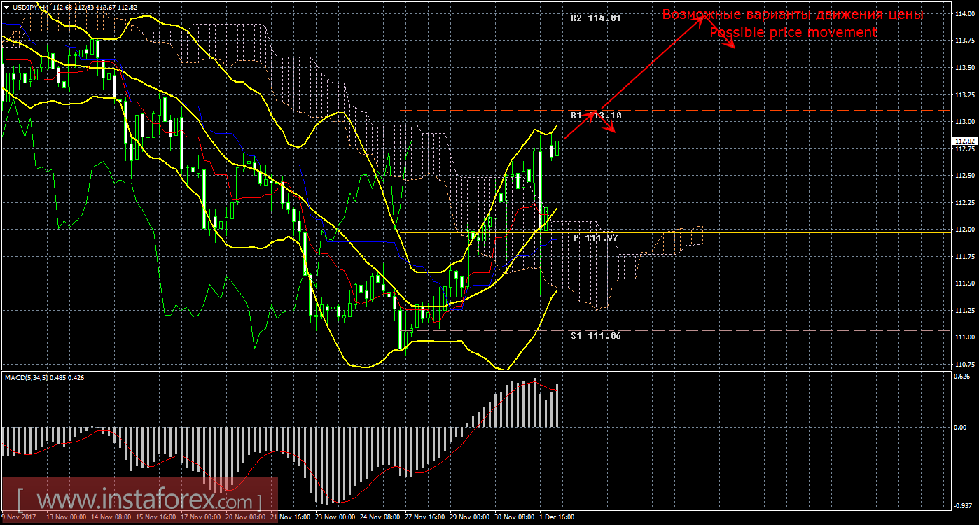 Английский фунт стерлингов тоже весьма сдержанно и без разнонаправленных движений отреагировал на пятничные события. Великобритания продолжает вести переговоры с ЕС по поводу условий выхода страны из Евросоюза, и по двум ключевым вопросам, размер компенсации и границы с Ирландией, к общему мнению стороны еще не пришли. 14 декабря пройдет саммит ЕС и до этого времени Тереза Мэй очень хочет найти общий язык с представителями Евросоюза. Похоже, что рост фунта стерлингов в последние недели был связан с позитивными ожиданиями трейдеров исхода переговоров. Таким образом, сигнал на покупку от Ишимоку остается сильным и подтвержденным, а длинные позиции – актуальными с целью первый уровень сопротивления 1,3605. На данный момент началась и может продолжиться нисходящая коррекция с целью линия Киджун-сен. После ее завершения ожидается возобновление восходящего тренда. Отскок цены от критической линии может спровоцировать это. Разворот индикатора MACD наверх также может указать на окончание коррекции. Полосы Боллинджера по-прежнему свидетельствуют о восходящей тенденции, но сейчас начали сужаться, что говорит о ее ослаблении. Индекс деловой активности в сфере производства Великобритании превысил прогнозы и составил 58,2, а индекс деловой активности ISM США за ноябрь, наоборот, не дотянул до прогнозного значения и составил 58,2.