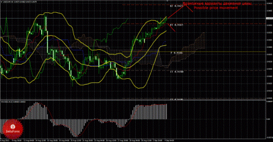 4 сентября пара доллар/франк продолжает отрабатывать «золотой крест» и преодолела первый уровень сопротивления, признаков начал коррекции пока что нет. Текущий сигнал на покупку – подтвержденный и сильный, так как Чинкоу Спан находится выше графика цены, а цена располагается выше облака Ишимоку. Поэтому сейчас целью для восходящего движения является второй уровень сопротивления 0,9427. В случае закрепления цены выше первого таргета будет доступна новая цель для восходящего движения – третий уровень сопротивления 0,9522. Восходящее движение имеет перспективы до тех пор, пока цена находится выше Киджун-сен(0,9300), если цена закрепится ниже критической линии Киджун-сен, то сигнал на покупку ослабится, а дальнейшее восходящее движение поставится под вопрос, зато может продолжиться нисходящее движение с целью пивот уровень 0,9266. Чинкоу Спан находится выше графика цены, что является подтверждением текущему сигналу на покупку и означает бычье настроение участников рынка по валютной паре доллар/франк. Боллинджер Бандс показывает продолжение восходящего движения, полосы немного сужаются и направлены вверх, поэтому на рынке сейчас актуальны длинные позиции. MACD направлен наверх, что сигнализирует о восходящем движении цены и разрешает сейчас рассматривать длинные позиции, если индикатор развернется вниз, это может быть сигналом к началу нисходящей коррекции. Также индикатор может начать разряжаться, с этим моментом следует быть предельно осторожными. Если цена закрепится ниже уровня 0,9361, это может засвидетельствовать нисходящее коррекционное движение.