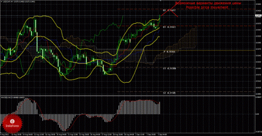 5 сентября пара доллар/франк продолжает отрабатывать «золотой крест» и преодолела первый уровень сопротивления, коррекция, которая вроде бы началась, сразу же завершилась. Текущий сигнал на покупку – подтвержденный и сильный, так как Чинкоу Спан находится выше графика цены, а цена располагается выше облака Ишимоку. Поэтому сейчас целью для восходящего движения является второй уровень сопротивления 0,9427. В случае закрепления цены выше первого таргета будет доступна новая цель для восходящего движения – третий уровень сопротивления 0,9522. Восходящее движение имеет перспективы до тех пор, пока цена находится выше Киджун-сен(0,9345), если цена закрепится ниже критической линии Киджун-сен, то сигнал на покупку ослабится, а дальнейшее восходящее движение поставится под вопрос, зато может продолжиться нисходящее движение с целью пивот уровень 0,9266. Чинкоу Спан находится выше графика цены, что является подтверждением текущему сигналу на покупку и означает бычье настроение участников рынка по валютной паре доллар/франк. Боллинджер Бандс показывает продолжение восходящего движения, полосы вновь немного расширяются и направлены вверх, поэтому на рынке сейчас актуальны длинные позиции. MACD направлен вниз, что сигнализирует о нисходящем движении цены и не разрешает сейчас рассматривать длинные позиции, если индикатор развернется наверх, это может быть сигналом к завершению витка коррекции. Индикатору, находясь на максимальных значениях, сложно развернуться наверх, поэтому коррекция, возможно, уже завершена, а индикатор опаздывает с сигналом. Отскок от уровня 0,9427 может спровоцировать новый виток коррекции.