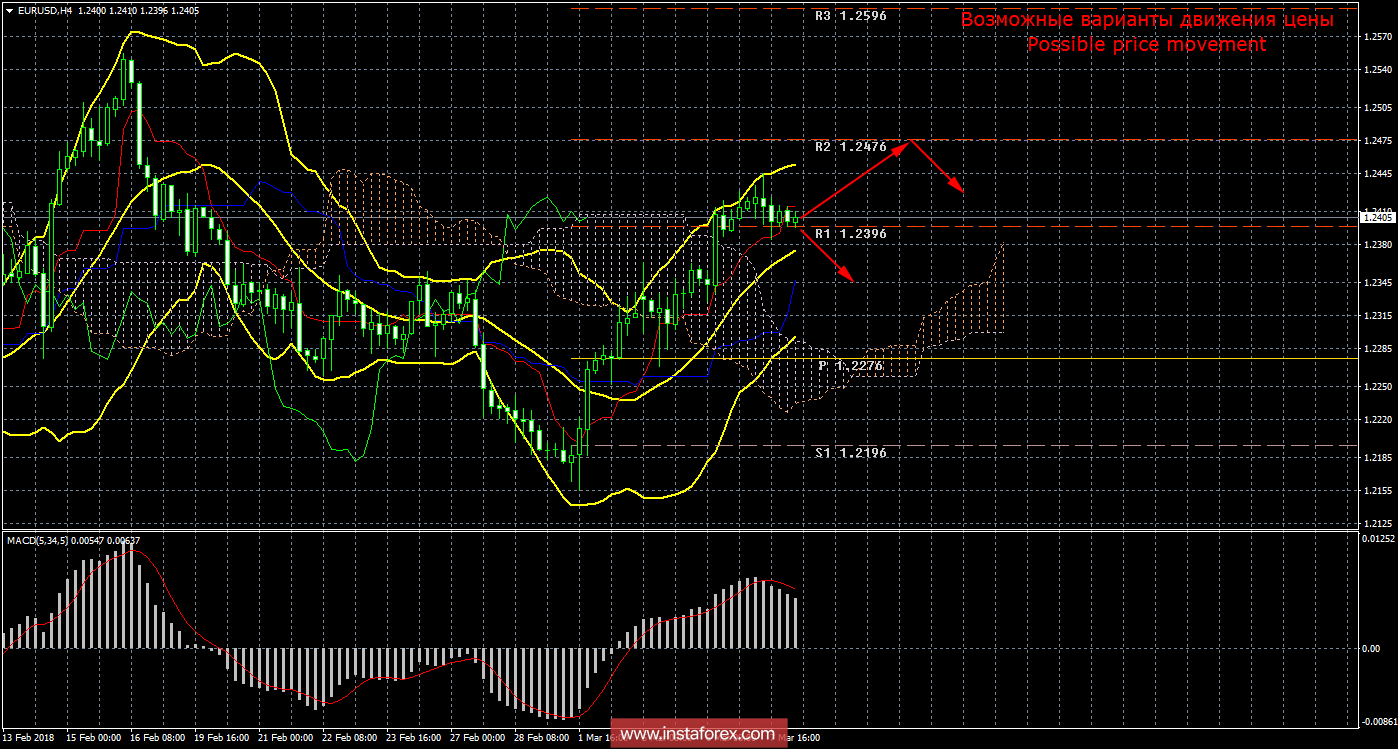 Третий торговый день недели можно охарактеризовать разносторонними движениями без ярко выраженного лидера. Доллар США получил одно-дневную передышку, но в целом все равно остается под давлением, на фоне опасения инвесторов относительно торговой войны, которую могут устроить Штаты. Тема торговой войны все же была немного ослаблена, так как министр финансов Стивен Мнучин заявил, что Мексика и Канада могут быть освобождена от пошлин на импорт, если переговоры по созданию торгового союза пройдут успешно. Каких-либо заявлений от Китая, которого очень даже касается возможное введение пошлин на импорт стали и алюминия США, не поступало. Скорее всего, Китай вслед за Евросоюзом может ответить Штатам введением своих санкций. Все это если случится, будет означать накаливание торговых отношений между крупнейшими странами мира, что будет оказывать на доллар давлением и в дальнейшем. С технической точки зрения длинные позиции сейчас являются актуальными, так как «золотой крест» является сильным, а цена преодолела облако Ишимоку и первый таргет 1,2396. Целью для восходящего движения на данный момент выступает второй уровень сопротивления 1,2476. Индикатор MACD развернулся вниз, указывая на начало коррекции. Его разворот вверх может просигнализировать о ее завершении. Полосы Боллинджера направлены наверх и расширяются, что свидетельствует о восходящей тенденции по инструменту. Средняя волатильность по инструменту составляет сейчас около 90 пунктов в день.