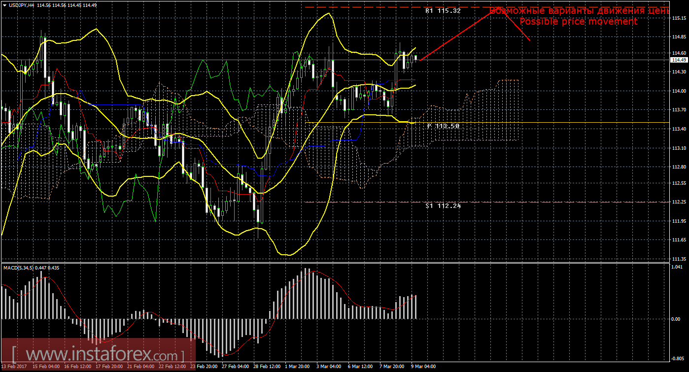 Анализируя пару доллар/иена на рынке Форекс 9 марта, видим, что цена не смогла даже отработать верхнюю границу облака и возобновила восходящий тренд. Текущий сигнал на покупку является и подтвержденным, и сильным, так как Чинкоу Спан находится выше графика цены, а цена располагается выше облака, поэтому сейчас целью для движения вверх выступает первый уровень сопротивления 115,32. Если этот таргет будет преодолен, то новой целью будет выступать уровень сопротивления 116,58. Восходящее движение будет актуально до тех пор, пока цена находится выше критической линии Киджун-сен (114,15). Если цена уйдет ниже Киджун-сен, то текущий сигнал вновь ослабится, движение вверх будет опять отменено, нисходящее движение сможет попытаться продолжиться с целью линия Сенкоу Спан Б, а ордера на покупку вновь станут не актуальными. Боллинджер Бандс показывает начало восходящего движения, полосы расширяются и направлены вверх, поэтому сейчас на рынке рекомендуется рассматривать варианты лонгов. MACD направлен вверх, сигнализируя о текущем восходящем движении, если индикатор сменит направление на нисходящее, это укажет на начало нисходящей коррекции. Отскок цены от уровня сопротивления 115,32 также может спровоцировать виток коррекции.