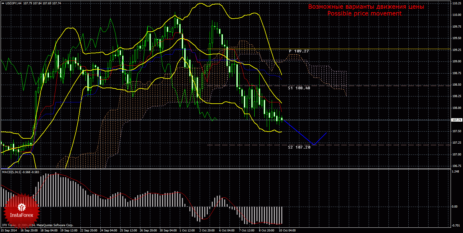 Анализируя курс иены на рынке Форекс 10 октября, видим, что цена возобновила нисходящее движение, но индикатор MACD может начать разряжаться. Текущий сигнал на продажу является подтвержденным и сильным, так как Чинкоу Спан закрепился ниже графика цены, а цена располагается ниже облака Ишимоку, поэтому сейчас целью для нисходящего движения выступает второй уровень поддержки 107,20. Если цена закрепится ниже этого уровня, то новой целью будет выступать третий уровень поддержки 106,41. Нисходящее движение актуально до тех пор, пока цена находится ниже критической линии Киджун-сен (108,65), если цена закрепится выше линии Киджун-сен, то «мертвый крест» будет ослаблен, дальнейшее нисходящее движение - поставлено под вопрос, восходящее движение может возобновиться с целью пивот - уровень 109,27, а шорты потеряют свою актуальность. Чинкоу Спан находится ниже графика цены, что является подтверждением текущего сигнала на продажу и означает "медвежье" настроение участников рынка по валютной паре доллар/иена. Боллинджер Бандс показывает продолжение нисходящего движения, полосы немного сужаются и направлены вниз, поэтому сейчас на рынке рекомендуется рассматривать варианты коротких позиций. MACD направлен вниз, что говорит о текущем нисходящем движении, если индикатор развернется вверх, это может засвидетельствовать начало коррекции. Индикатор также может начать разряжаться. Отскок цены от уровня 107,20 также может спровоцировать виток восходящей коррекции.