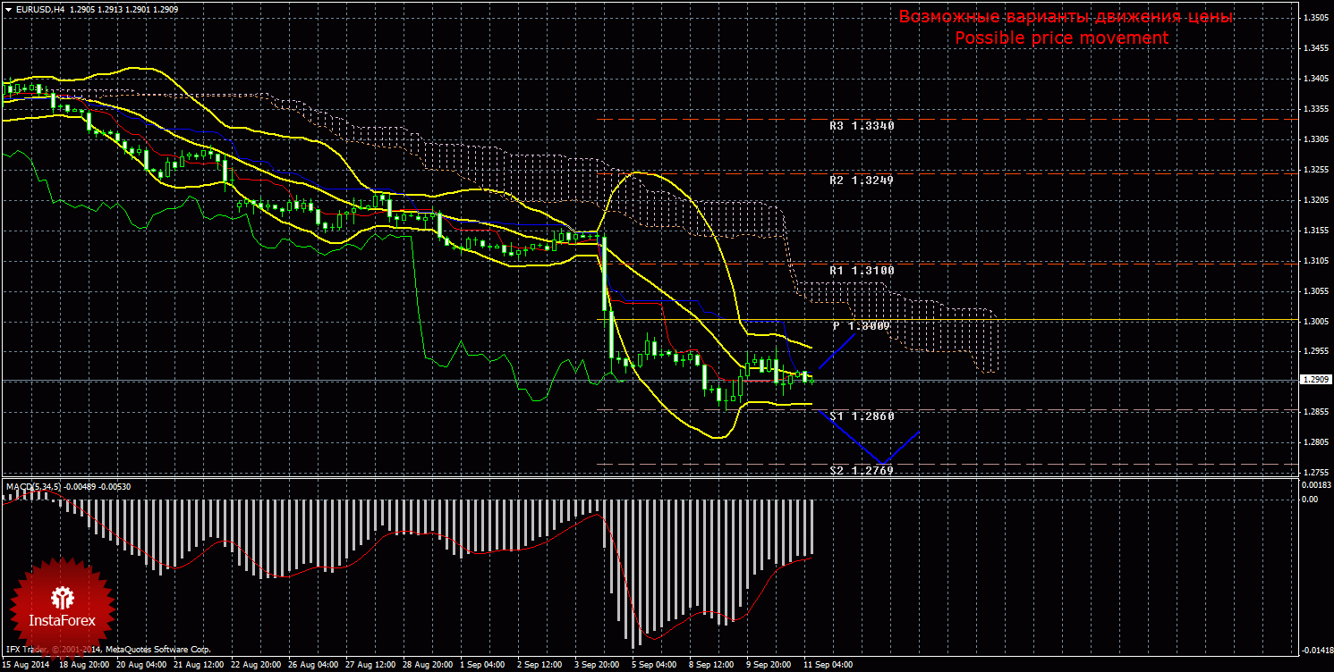 Анализ рынка Форекс по евро за 11 сентября показывает, что цена продолжает корректироваться, не сумев преодолеть первый таргет. Текущий сигнал на продажу подтвержденный и сильный, так как Чинкоу Спан находится ниже графика цены, а цена располагается ниже облака Ишимоку. На данный момент целью нисходящего движения является первый уровень поддержки 1,2860, который уже был достигнут, но не преодолен. В случае закрепления цены ниже первого таргета, нисходящее движение может продолжиться с целью второй уровень поддержки 1,2769. Нисходящее движение будет актуальным до тех пор, пока цена находится ниже Киджун-сен(1,2920), если цена закрепится выше критической линии, то сигнал на продажу будет ослаблен и может отмениться, короткие позиции потеряют свою актуальность, а дальнейшее нисходящее движение будет под вопросом, восходящее движение сможет попытаться продолжиться с целью пивот уровень 1,3009. Чинкоу Спан находится ниже графика цены, что является подтверждением текущему сигналу на продажу и означает медвежье настроение трейдеров. Боллинджер Бандс показывает нисходящее движение, полосы сужаются и направлены вниз, поэтому сейчас актуальны короткие позиции на рынке. MACD развернулся наверх, что свидетельствует о текущем коррекционном движении, разворот индикатора вниз может просигнализировать о завершении коррекции. Отскок цены от критической линии также может спровоцировать возобновление нисходящего тренда.