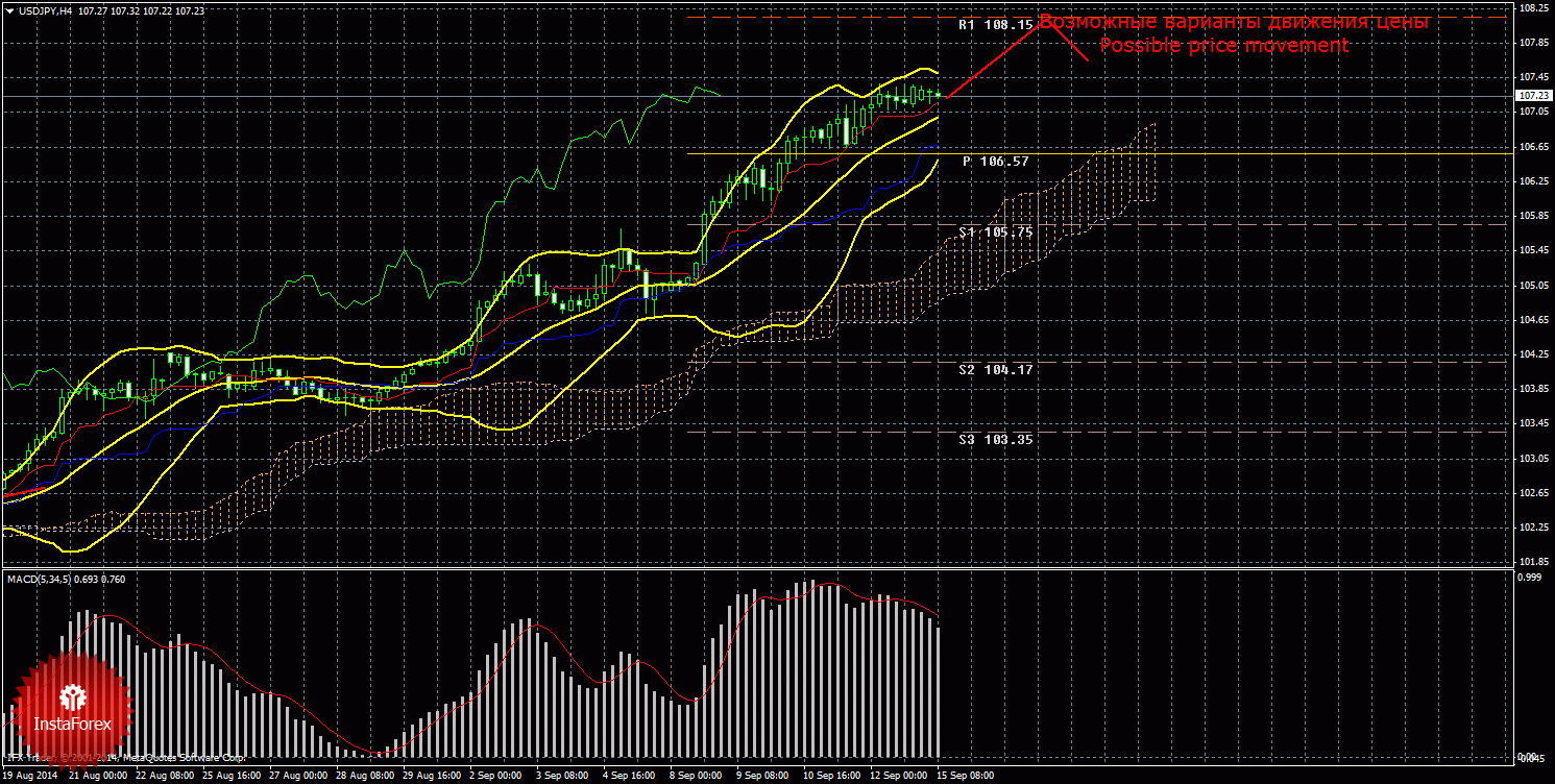 Анализируя курс иены на рынке Форекс 15 сентября, видно, что цена продолжает сильный восходящий тренд, индикатор MACD продолжает разряжаться. Текущий сигнал на покупку является подтвержденным и сильным, так как Чинкоу Спан находится выше графика цены, а цена располагается выше облака Ишимоку. Поэтому сейчас целью для восходящего движения выступает первый уровень сопротивления 108,15. В случае преодоления первого таргета, восходящее движение может продолжиться с целью – второй уровень сопротивления 108,97. Восходящее движение актуально до тех пор, пока цена находится выше критической линии Киджун-сен(106,65), если цена закрепится ниже линии Киджун-сен, то «золотой крест» будет ослаблен, дальнейшее восходящее движение поставлено под вопрос, лонги потеряют свою актуальность, а нисходящее движение может попытаться продолжиться с целью первый уровень поддержки 105,75. Чинкоу Спан находится выше графика цены, что является подтверждением текущему сигналу на покупку и означает бычье настроение участников рынка по валютной паре доллар/иена. Боллинджер Бандс показывает продолжение восходящего движения, полосы расширяются и направлены наверх, поэтому сейчас на рынке рекомендуется рассматривать варианты длинных позиций. MACD развернулся вниз, что говорит о текущем нисходящем движении, но цена не понижается, поэтому индикатор сейчас продолжает разряжаться. Отскок цены от уровня 108,15 может спровоцировать виток нисходящей коррекции.