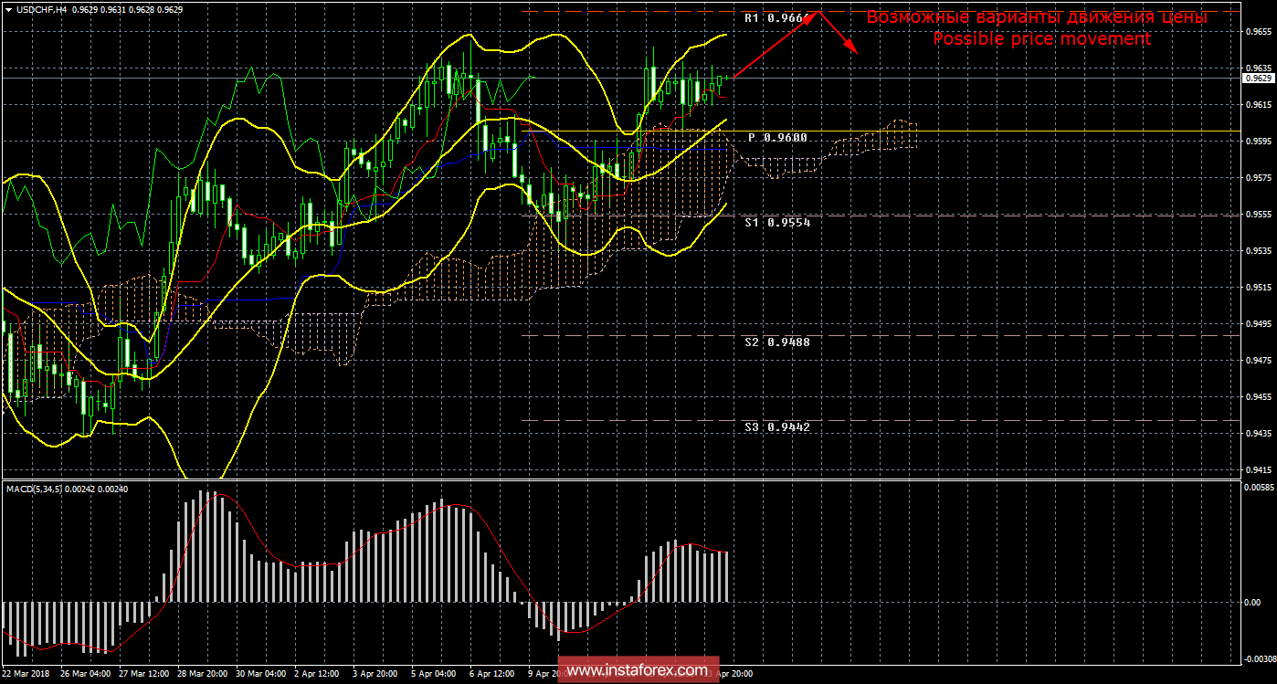 По валютной паре USD/CHF 13 апреля движение было преимущественно боковое. Волатильность снизилась до минимальных 39 пунктов на фоне полного отсутствия любой макроэкономической информации из Америки или Швейцарии. Плюс к этому многие трейдеры в конце недели фиксировали прибыль, что привело к началу слабой коррекции. Ключевыми темами дня на валютном рынке остаются Сирия и Китай. Несмотря на то, что Штаты продолжают угрожать Китаю введением многомиллиардных торговых пошлин, в последние дни доллар США продолжал укрепляться по отношению к швейцарскому франку. Однако, в долгосрочной перспективе, вряд ли такой уверенный спрос на доллар США сохраниться. С самого первого дня своего президентствования, Дональд Трамп своими действиями и словами регулярно обесценивал курс доллара. Он и сам не раз отмечал, что является приверженцем «дешевой» валюты. Таким образом, практически в любом случае у американской валюты есть «потолок» для роста. Новый сигнал на покупку, который является сильным, так как цена преодолела облако Ишимоку, продолжает отрабатываться. Таргетом для движения вверх выступает сейчас первый уровень сопротивления 0,9666. Полосы Боллинджера направлены наверх и расширяются, что указывает на восходящую тенденцию по инструменту. Индикатор MACD развернулся вниз, указывая на начало коррекции, которая сейчас является больше боковой, нежели нисходящей. Средняя волатильность валютной пары снизилась до 50 пунктов в день.