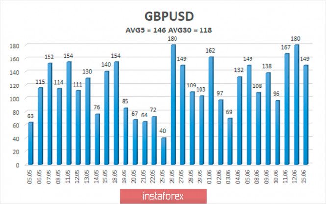 Средняя волатильность валютной пары евро/доллар по состоянию на 16 июня составляет 119 пунктов. Таким образом, значение показателя по-прежнему характеризуется, как «высокое», благодаря последним торговым дням. Мы ожидаем движение пары сегодня между уровнями 1,1196 и 1,1434. Разворот индикатора Хайкен Аши обратно вниз просигнализирует о возможном возобновлении нисходящего движения.