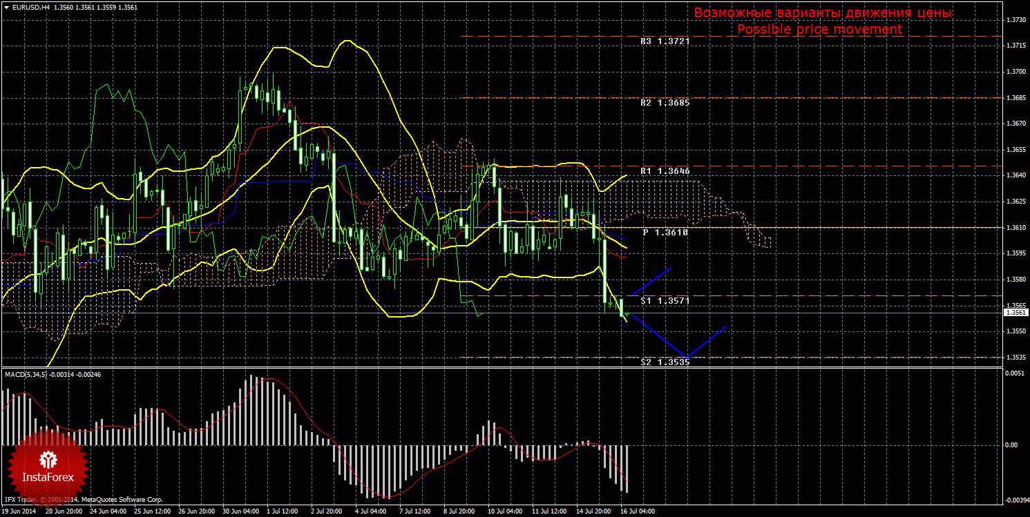 Анализ рынка Форекс по евро за 16 июля показывает, что цена возобновила нисходящее движение, полосы Боллинджера начали расширяться вниз. Текущий сигнал на продажу подтвержденный и сильный, так как Чинкоу Спан закрепился ниже графика цены, а цена располагается ниже облака Ишимоку. На данный момент целью нисходящего движения является второй уровень поддержки 1,3535. В случае закрепления цены ниже первого таргета, нисходящее движение может продолжиться с целью третий уровень поддержки 1,3496. Нисходящее движение сохраняется до тех пор, пока цена находится ниже Киджун-сен(1,3600), если цена закрепится выше критической линии, то сигнал на продажу будет ослаблен и может отмениться, короткие позиции потеряют свою актуальность, а дальнейшее нисходящее движение будет поставлено под вопрос, восходящее движение же может попытаться продолжиться с целью верхняя граница облака Ишимоку. Чинкоу Спан находится ниже графика цены, что является подтверждением текущему сигналу на продажу и означает медвежье настроение трейдеров. Боллинджер Бандс показывает начало нисходящего движения, полосы расширяются и направлены вниз, поэтому сейчас актуальны короткие позиции. MACD развернулся вниз, что свидетельствует о текущем нисходящем движении, разворот индикатора наверх может просигнализировать о витке восходящей коррекции. Отскок цены от уровня 1,3535 также может спровоцировать коррекционное движение.