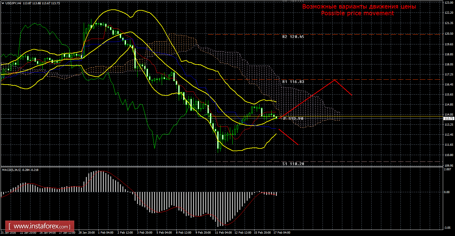Анализируя курс иены на рынке Форекс 17 февраля, видим, что цена не смогла отработать даже нижнюю границу облака и начала корректироваться. Текущий сигнал на покупку является не подтвержденным и слабым, так как Чинкоу Спан находится ниже графика цены, а цена располагается ниже облака Ишимоку, поэтому сейчас целью для восходящего движения является первый уровень сопротивления 116,83, но открывать длинные позиции можно будет не раньше закрепления цены выше облака Ишимоку. Если этот таргет будет преодолен, то новой актуальной целью будет выступать второй уровень сопротивления 120,45. Восходящее движение актуально до тех пор, пока цена находится выше критической линии Киджун-сен (112,90), если цена закрепится ниже Киджун-сен, то текущий сигнал будет ослаблен и поставлен на грань отмены, восходящее движение будет отменено, нисходящее движение сможет продолжиться с целью первый уровень поддержки 110,28. Чинкоу Спан находится ниже графика цены, что не является подтверждением текущего сигнала на покупку и означает «медвежье» настроение участников рынка по валютной паре доллар/иена. Боллинджер Бандс показывает начало восходящего движения, полосы не расширяются и направлены вверх, поэтому сейчас на рынке рекомендуется рассматривать варианты ордеров на покупку, но после преодоления облака. MACD направлен вниз, что говорит о текущем коррекционном движении, если индикатор развернется обратно вверх, это может означать окончание нисходящей коррекции. Отскок цены от линии Киджун-сен также может спровоцировать возобновление восходящего движения.