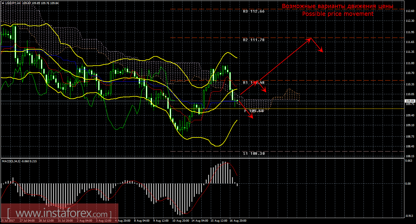 Анализ пары доллар/иена на рынке Форекс 17 августа показывает, что цена скорректировалась к критической линии, но не смогла пока что закрепиться ниже нее. Текущий сигнал на покупку является подтвержденным и слабым, так как Чинкоу Спан продолжает находиться выше графика цены, а цена закрепилась внутри облака Ишимоку. Поэтому сейчас целью для движения вверх является уровень сопротивления 110,48, но после закрепления цены выше облака. Если этот таргет будет преодолен, то новой целью будет выступать третий уровень сопротивления 111,78. Восходящее движение актуально до тех пор, пока цена находится выше критической линии Киджун-сен (109,85). Если цена закрепится ниже этой линии, то «золотой крест» будет ослаблен до предела, движение вверх – станет не актуальным, нисходящее движение сможет попытаться продолжиться с целью уровень поддержки 108,30, а ордера на покупку станут не доступными для открытия. Боллинджер Бандс показывает продолжение восходящего движения, полосы немного сужаются и направлены наверх, поэтому сейчас на рынке рекомендуется рассматривать варианты лонгов. MACD развернулся вниз, сигнализируя о текущем восходящем движении. Разворот индикатора наверх укажет на окончание нисходящей коррекции. Отскок цены от Киджун-сен также может засвидетельствовать возобновление восходящего движения. Амплитуда инструмента в среду составила 92 пункта, а пройденная дистанция – 243 пункта, что означает среднюю волатильность инструмента.