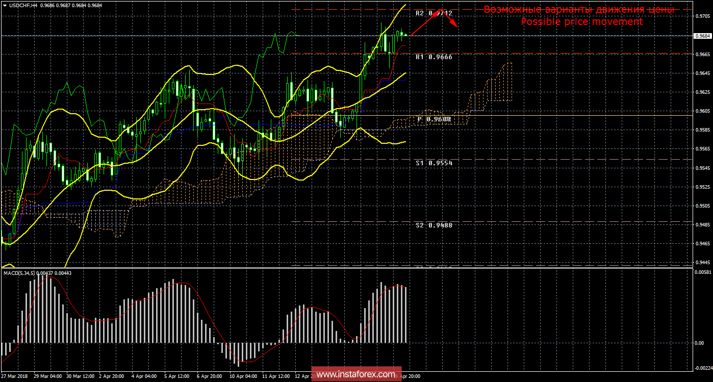 Волатильность по валютной паре USD/CHF днем ранее вызвала у нас немало удивлений, но уже вчера, 18 апреля, все вернулось на свои места. Инструменту показал характерную для себя активность около 50 пунктов в день. Единственным событием дня, относящимся к франку или доллару, была публикация «Бежевой книги». Впрочем, уже традиционно особой реакции у рынка эта сводка экономических отчетов по регионам не вызвала. Как и неоднократно ранее, большая часть регионов отметила сдержанный рост занятости, зарплат и экономического роста. Сейчас только некоторые отрасли выказали обеспокоенность возможным введением пошлин на китайские товары. Из Швейцарии и никаких макроэкономических новостей не поступало. Тема с китайскими пошлинами на импорт, похоже, надоела уже даже самому Трампу. Тем не менее, каким-то образом эта история должна завершиться. Таким образом, в ближайшее время ждем новых заявлений президента США относительно будущих торговых отношений между Штатами и Китаем. С технической точки зрения продолжает отрабатываться сигнал на покупку, который является сильным, так как цена располагается выше облака Ишимоку. Таргетом для движения вверх выступает сейчас второй уровень сопротивления 0,9712. Полосы Боллинджера направлены наверх и расширяются, что указывает на восходящую тенденцию по инструменту. Индикатор MACD направлен наверх, указывая на продолжение восходящего тренда. Разворот индикатора MACD вниз укажет на начало коррекции. Средняя волатильность валютной пары составляет 64 пункта в день.