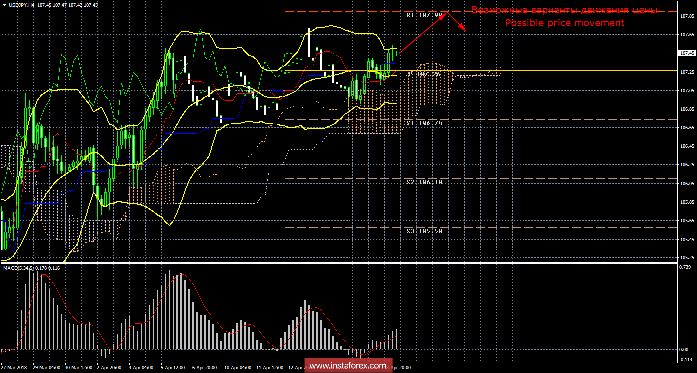 Валютная пара USD/JPY в среду, 18 апреля, также показала минимальную волатильность. Новых сообщений из Сирии не поступало, также не было никаких новых заявлений Трампа о торговых пошлинах на китайские товары. Макроэкономическая сводка отчетов «Бежевая книга» также не вызвала практически никакой реакции у участников рынка. Сегодняшний день в плане макроэкономических событий будет мало чем отличаться от вчерашнего дня. Из отчетов можно отметить только число заявок на пособие по безработице в Америке, однако вряд ли этот показатель вызовет реакцию у трейдеров. Таким образом, надежда лишь на какие-либо новые заявления Трампа, если они, конечно, будут. Лишь поздно вечером будет опубликована инфляция в Японии, которая больше относится уже к следующему дню. С технической точки зрения продолжает отрабатываться новый сигнал от Ишимоку «мертвый крест», который сейчас является слабым, так как цена располагается выше облака и критической линии. В ближайшее время этот сигнал может отмениться. Таким образом, ордера на продажу сейчас не доступны для рассмотрения. Целью для движения вниз (формально) остается первый уровень поддержки 106,74. Разворот индикатора MACD вниз может просигнализировать о попытке возобновить движение вниз. Полосы Боллинджера развернулись вбок, что указывает на некоторую неопределенность с тенденцией по инструменту. Средняя волатильность по инструменту снизилась до 52 пунктов в день.