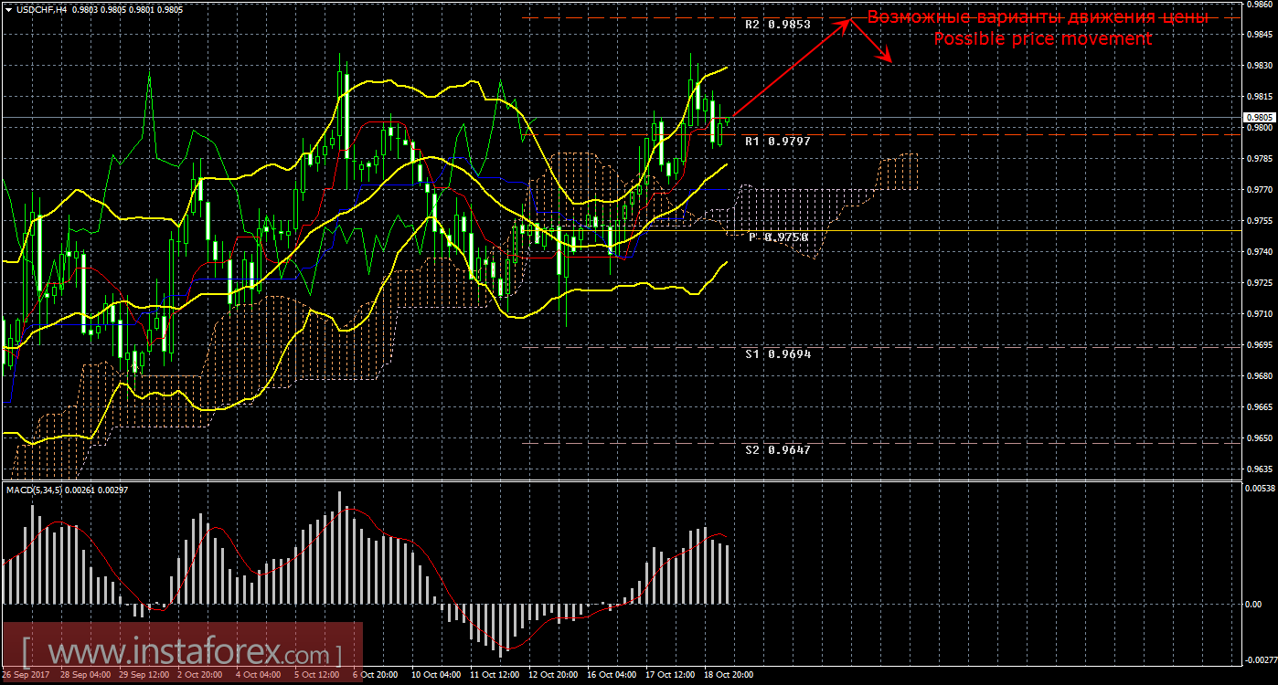 Сохраняя перспективы продолжения формирования восходящего тренда, валютная пара USD/CHF начала корректироваться благодаря слабому показателю объема выданных разрешений на новой строительство в США. В принципе, одного этого показателя хватило, чтобы трейдеры немного убавили свой пыл и начали коррекцию с целью линия Киджун-сен. В Швейцарии 18 октября вновь не было ни одного значимого экономического события. Таким образом, коррекция может продолжиться сегодня, 19 октября. В пользу продолжения коррекции также говорит отскок цены от первого таргета 0,9827...