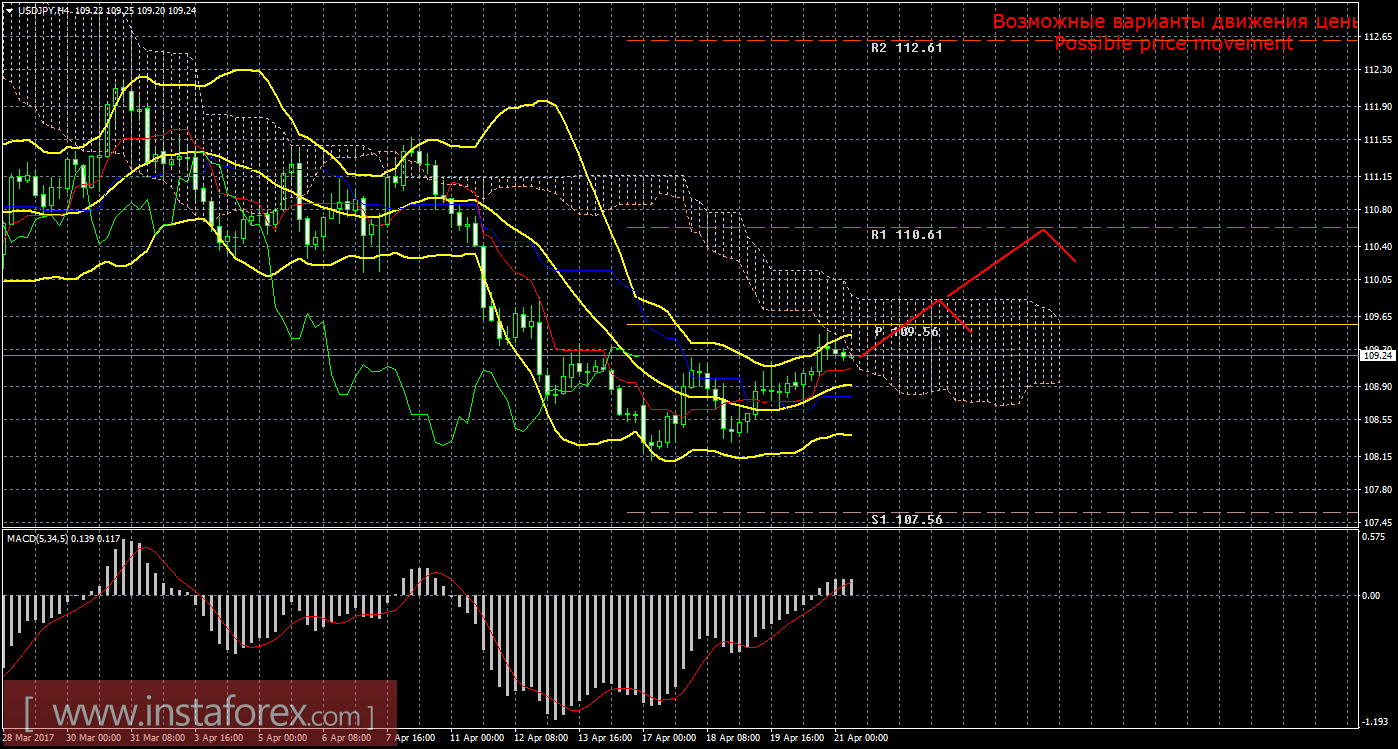 Анализируя пару доллар/иена на рынке Форекс 21 апреля, видно, что цена продолжает несильное восходящее движение и сформировала «золотой крест». Текущий сигнал на покупку является подтвержденным и слабым, так как Чинкоу Спан закрепился выше графика цены, а цена располагается ниже облака Ишимоку. Поэтому сейчас целью для движения вверх является уровень сопротивления 110,61, но открывать лонги можно будет не ранее преодоления облака Ишимоку. Если этот таргет будет преодолен, то новой целью будет выступать уровень сопротивления 112,31. Восходящее движение будет актуально до тех пор, пока цена находится выше критической линии Киджун-сен (108,80). Если цена закрепится ниже Киджун-сен, текущий «золотой крест» будет поставлен на грань отмены, движение вверх – отменится, а нисходящее движение сможет возобновиться с целью первый уровень поддержки 107,56. Боллинджер Бандс показывает начало восходящего движения, полосы не расширяются и направлены вверх, поэтому сейчас на рынке рекомендуется рассматривать варианты ордеров на покупку, но только после усиления сигнала от Ишимоку. MACD направлен наверх, сигнализируя о текущем восходящем движении. Если индикатор сменит направление на нисходящее, это укажет на начало нисходящей коррекции, как и отскок от линии Сенкоу Спан Б.