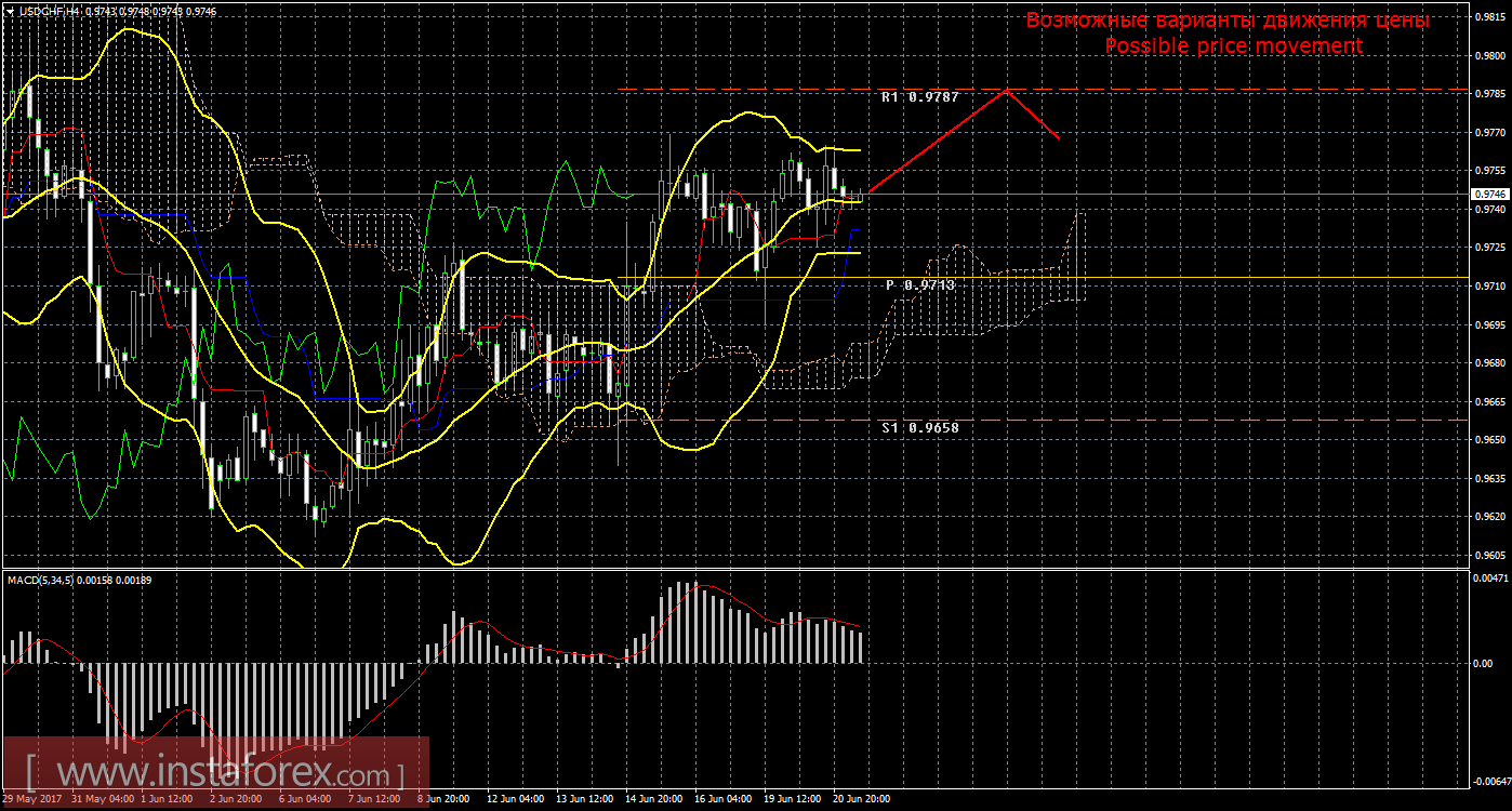 Анализируя пару доллар/франк 21 июня, видно, что цена начала новый виток коррекции, а индикатор MACD по-прежнему направлен вниз. Текущий сигнал является подтвержденным и сильным, так как линия Чинкоу Спан находится выше графика цены, а цена располагается выше облака Ишимоку. На данный момент целью для восходящего движения остается уровень сопротивления 0,9787. Следующим таргетом выступает уровень сопротивления 0,9842. Восходящее движение имеет перспективы только выше линии Киджун-сен (0,9730), если цена уйдет ниже этой линии, то «золотой крест» будет поставлен на грань отмены, а восходящее движение будет отменено, движение вниз сможет продолжиться с целью уровень поддержки 0,9658, а лонги потеряют свою актуальность. Боллинджер Бандс показывает продолжение восходящего движения, полосы сужаются и направлены вверх, поэтому сейчас на рынке актуальны варианты длинных позиций. MACD направлен вниз, что сигнализирует о коррекционном движении, разворот индикатора наверх укажет на завершение нисходящей коррекции. Отскок цены от критической линии также может спровоцировать возобновление восходящего тренда.