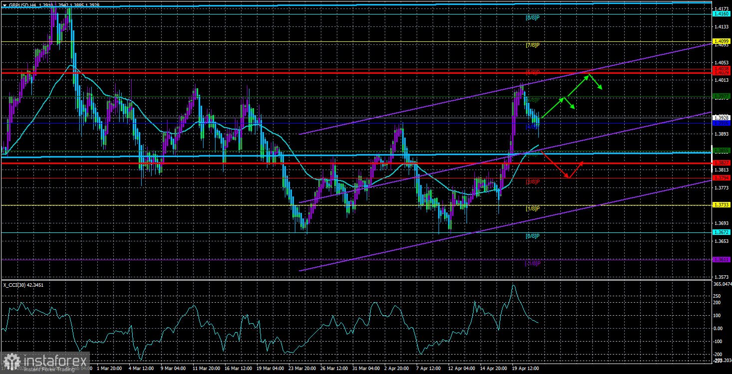 Средняя волатильность пары GBP/USD составляет на данный момент 101 пункт в день. Для пары фунт/доллар это значение является «средним». В четверг, 22 апреля, таким образом, мы ожидаем движения внутри канала, ограниченного уровнями 1,3827 и 1,4029. Разворот индикатора Хайкен Аши наверх может просигнализировать о завершении нисходящей коррекции.