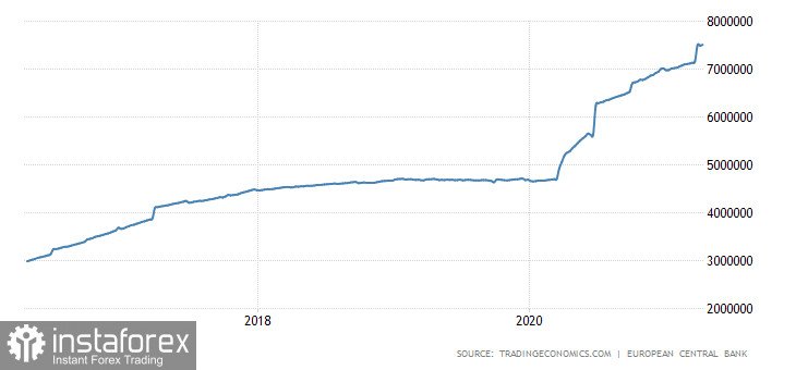 На иллюстрации видно, что баланс Банка Англии вырос с начала 2020 года со значения 580 миллиардов фунтов до значения 940 миллиардов фунтов в марте 2021 года. Таким образом, баланс увеличился на 70-80% или на 360 миллиардов фунтов. Эти деньги с высокой долей вероятности были напечатаны или созданы на банковских счетах из ниоткуда. Далее посмотрим на данные ЕЦБ.