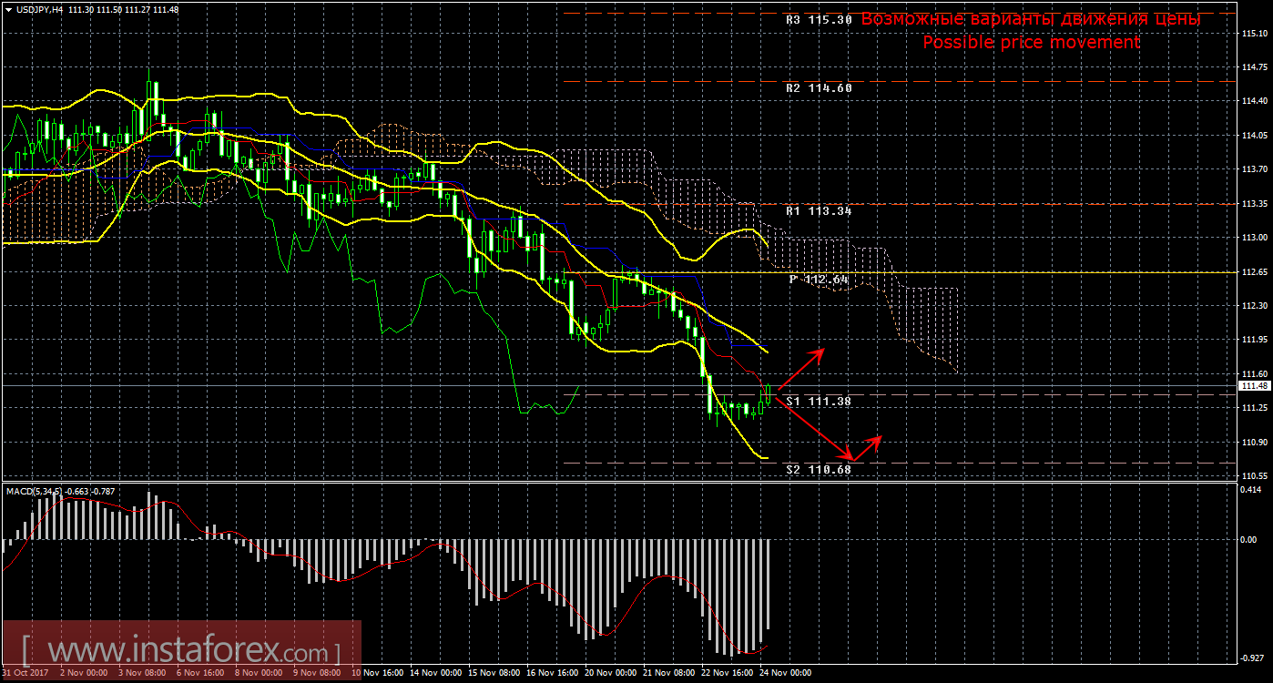 Валютная пара USD/JPY, так же как и многие другие, начала корректироваться с праздничный для США день, День Благодарения. Целью для восходящей коррекции выступает линия Киджун-сен, но учитывая пониженную волатильность (всего 31 пункт), отработать эту линию получиться в лучшем случае сегодня. Индикатор MACD развернулся наверх, сигнализирую о начале коррекции. Индекс деловой активности в секторе производства в Японии, опубликованный ночью, оказался выше прогнозов, - 53,8. Больше на сегодняшний день не запланировано никаких макроэкономических новостей. Таким образом, сегодня волатильность может оставаться низкой, так как индексы деловой активности в сферах услуг и производства в Штатах вряд ли вызовут бурную реакцию валютных трейдеров. Однако, разворот индикатора MACD вниз все-таки может просигнализировать о завершении текущей коррекции и возобновлении нисходящего движения с целью второй уровень поддержки 110,68. Полосы Боллинджера продолжают сигнализировать о нисходящей тенденции, а сигнал на продажу от Ишимоку остается сильным и подтвержденным. Таким образом, короткие позиции сейчас доступны для рассмотрения. Средняя волатильность инструмента остается на довольно высоком уровне – 84 пункта – однако это не означает, что сегодня мы увидим именно такую цифру показателя.