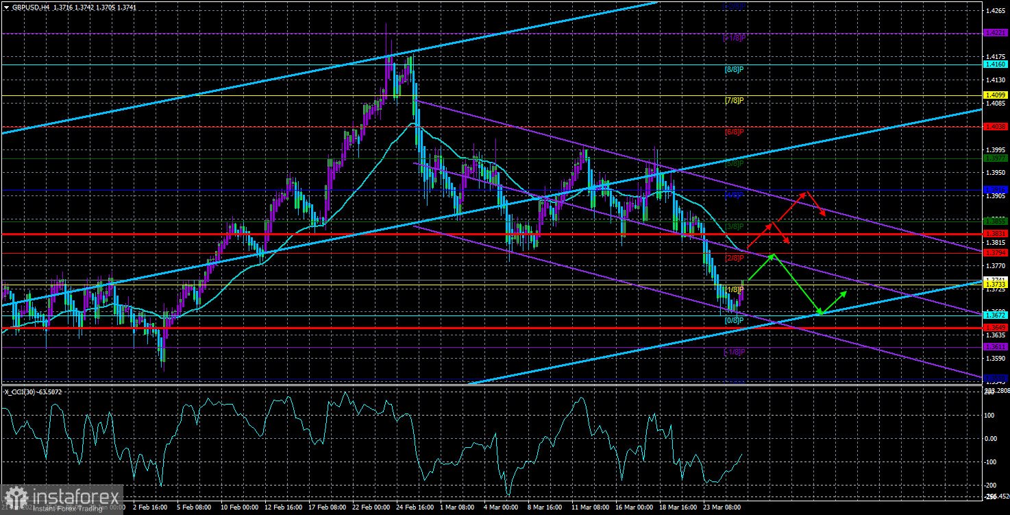 Валютная пара EUR/USD в четверг, 25 марта, продолжала не слишком сильное и неспешное движение вниз. После того как быкам не покорился уровень 1,1980 два раза, возобновилось нисходящее движение, которое, с нашей точки зрения, полностью логично и обосновано в данное время. Мы напоминаем, что в течение последнего года европейская валюта довольно сильно укрепилась против доллара США, поэтому текущее движение вниз может быть просто банальной коррекцией в глобальном плане. Собственно, именно коррекцией это движение и является, если рассматривать 24-часовой таймфрейм. На 4-часовом таймфрейме сформировалась нисходящая тенденция. Оба канала линейной регрессии направлены вниз, цена располагается ниже скользящей средней линии. Таким образом, как мы уже неоднократно говорили, еще некоторое время доллар США вполне может расти. Однако в целом его перспективы остаются достаточно туманными.