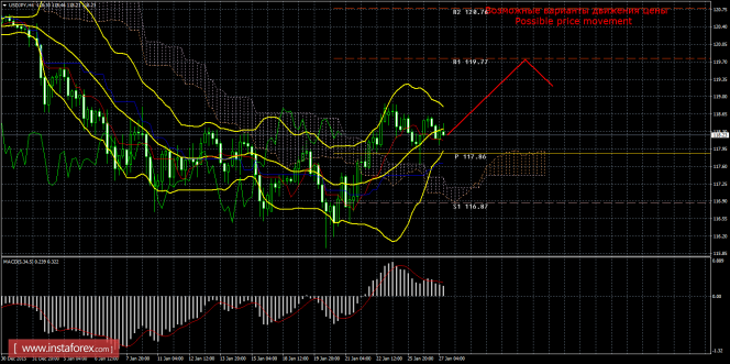 Анализируя курс иены на рынке Форекс 27 января, видим, что цена продолжает корректироваться, хотя были попытки возобновить восходящий тренд. Текущий сигнал на покупку является подтвержденным и сильным, так как Чинкоу Спан закрепилась выше графика цены, а цена располагается выше облака Ишимоку, поэтому сейчас целью для восходящего движения является первый уровень сопротивления 119,77. Если этот таргет будет преодолен, то новой актуальной целью будет выступать второй уровень сопротивления 120,76. Восходящее движение актуально до тех пор, пока цена находится выше критической линии Киджун-сен (117,65), если цена закрепится ниже Киджун-сен, то «золотой крест» будет ослаблен и поставлен на грань отмены, восходящее движение отменится, нисходящее движение сможет продолжиться с целью первый уровень поддержки 116,87, а ордера на покупку станут не актуальными. Чинкоу Спан находится выше графика цены, что является подтверждением текущего сигнала на покупку и означает «бычье» настроение участников рынка по валютной паре доллар/иена. Боллинджер Бандс показывает продолжение восходящего движения, полосы сужаются и направлены вверх, поэтому сейчас на рынке рекомендуется рассматривать варианты длинных позиций. MACD направлен вниз, что говорит о текущем нисходящем движении, если индикатор поменяет направление движения на восходящее, это засвидетельствует окончание коррекции. Отскок цены от линии Киджун-сен также может засвидетельствовать завершение витка коррекции.