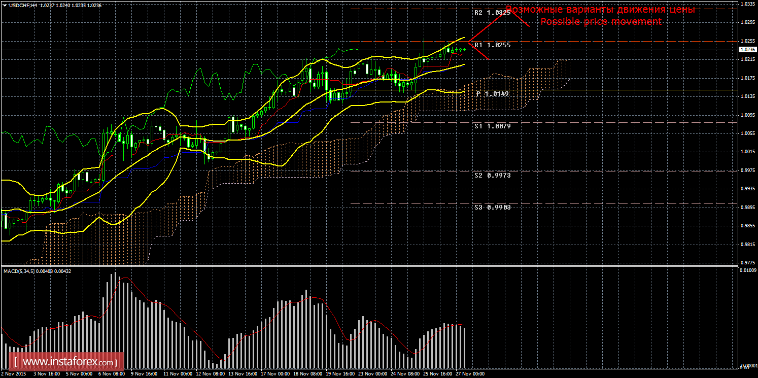 27 ноября пара доллар/франк продолжает слабое восходящее движение и почти достигла первого таргета во второй раз. Текущий сигнал на покупку подтвержденный и сильный, так как линия Чинкоу Спан закрепилась выше графика цены, а цена располагается выше облака Ишимоку, поэтому сейчас целью для восходящего движения является первый уровень сопротивления 1,0255, который уже был отработан. При преодолении первой цели, новым таргетом для восходящего движения станет второй уровень сопротивления 1,0325. Восходящее движение имеет перспективы до тех пор, пока цена находится выше линии Киджун-сен (1,0200), если цена вновь закрепится ниже критической линии, «золотой крест» будет опять ослаблен, а продолжение восходящего движения поставлено под вопрос, нисходящее движение сможет продолжиться с целью нижняя граница облака, а лонги станут не актуальными. Чинкоу Спан находится выше графика цены, что является подтверждением текущего сигнала на покупку и означает «бычье» настроение участников рынка по валютной паре доллар/франк. Боллинджер Бандс показывает продолжение восходящего движения, полосы немного расширяются и направлены вверх, поэтому сейчас на рынке актуальны длинные позиции. MACD развернулся вниз, что сигнализирует о коррекционном движении, однако цена не понижается, таким образом, делаем вывод, что индикатор начал разряжаться. Отскок цены от первого таргета также может спровоцировать начало коррекционного движения.