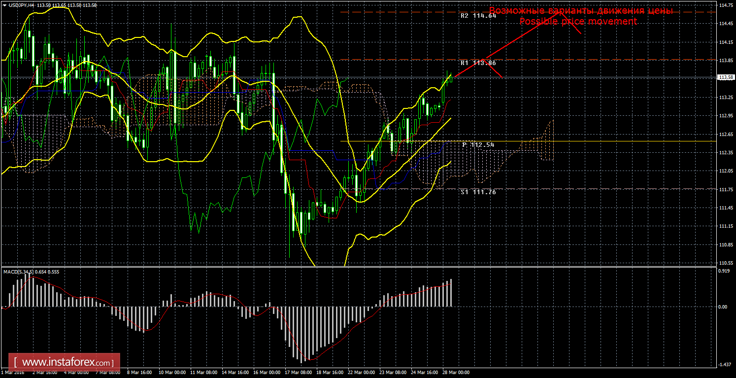 Анализируя курс иены на рынке Форекс 28 марта, видим, что цена продолжает восходящее движение без каких-либо признаков начала коррекции. Текущий сигнал на покупку является подтвержденным и сильным, так как Чинкоу Спан находится выше графика цены, а цена располагается выше облака Ишимоку, поэтому сейчас целью для восходящего движения является первый уровень сопротивления 113,86. Если этот таргет будет преодолен, то новой актуальной целью будет выступать второй уровень сопротивления 114,64. Восходящее движение актуально до тех пор, пока цена находится выше критической линии Киджун-сен (112,55), если цена закрепится ниже Киджун-сен, то текущий сигнал будет ослаблен и поставлен на грань отмены, восходящее движение будет отменено, нисходящее движение сможет продолжиться с целью первый уровень поддержки 111,76, а лонги потеряют свою актуальность. Чинкоу Спан находится выше графика цены, что является подтверждением текущего сигнала на покупку и означает «бычье» настроение участников рынка по валютной паре доллар/иена. Боллинджер Бандс показывает продолжение восходящего движения, полосы немного расширяются и направлены вверх, поэтому сейчас на рынке рекомендуется рассматривать варианты ордеров на покупку. MACD направлен вверх, что говорит о текущем восходящем движении, если индикатор поменяет направление движения на нисходящее, это укажет на виток нисходящей коррекции. Отскок цены от уровня сопротивления 113,86 также может спровоцировать начало коррекции.
