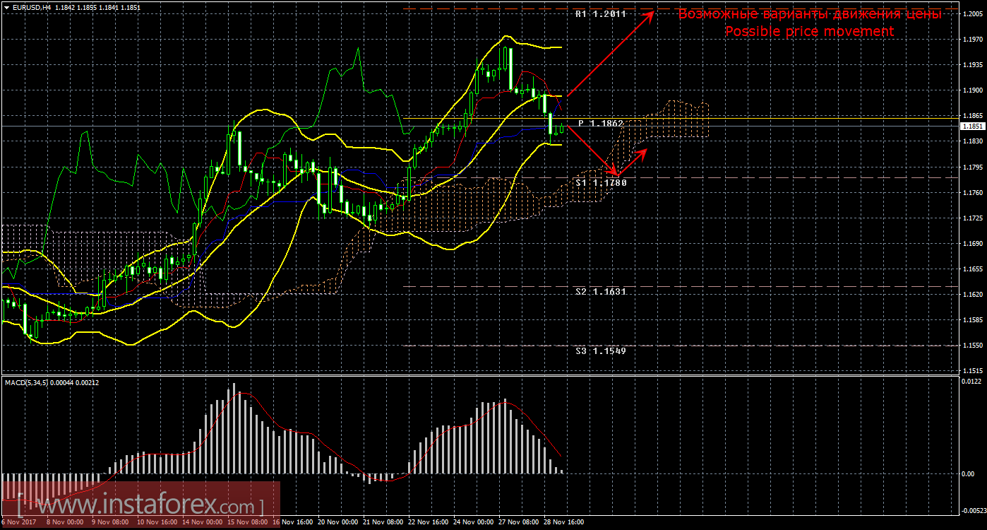 Все валютные пары, кроме, естественно, фунт/доллар, во вторник, 28 ноября, показали активные, но односторонние, движения. Во всех случаях подорожал американский доллар. Индикатор потребительской уверенности, опубликованный вчера в Штатах, составил 129,5, что гораздо выше и прогноза, и предыдущего значения. Помимо этого, было несколько выступлений от членов ФРС. По мнению Джером Пауэлла, аргументация в пользу продолжения повышения ставок присутствует, так как сильный рост оправдывает такую стратегию. Также Пауэлл отметил, что не видит никаких признаков перегрева экономики, а рост рабочей силы остается очень медленным. Пока что укрепление доллара США все еще вписывается в вариант с коррекцией. Однако, как видно из графика, линии Тенкан-сен и Киджун-сен уже пересеклись, поэтому движение вниз может продолжиться с целью первый уровень поддержки 1,1780. Короткие позиции на данный момент не актуальны, так как «мертвый крест» сейчас очень слабый. Лишь после преодоления облака Ишимоку шорты станут актуальными. Если цена закрепиться выше критической линии, то и восходящий тренд может возобновиться с целью первый уровень сопротивления 1,2011. Полосы Боллинджера пока что развернулись вбок, поэтому как таковой нисходящей тенденции сейчас нет. Средняя волатильность инструмента выросла вчера до 81 пункта в день.