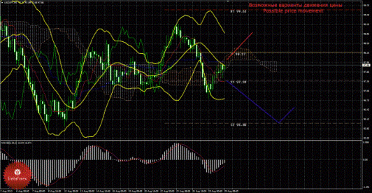 Анализируя курс иены на рынке Форекс 29 августа, видно, что цена продолжает отрабатывать «мертвый крест», но на данный момент протекает восходящее коррекционное движение. Текущий сигнал на продажу является подтвержденным и сильным, так как Чинкоу Спан закрепился ниже графика цены, а цена располагается ниже облака Ишимоку. Поэтому сейчас целью для нисходящего движения является второй уровень поддержки 96,03. В случае преодоления первого таргета, нисходящее движение может продолжиться с целью – третий уровень поддержки 95,15. Нисходящее движение актуально до тех пор, пока цена находится ниже критической линии Киджун-сен (98,00), если цена закрепится выше Киджун-сен, то «мертвый крест» ослабится и может отмениться, а дальнейшее нисходящее движение поставится под сомнение, в этом случае может попытаться возобновиться восходящее движение с целью первый уровень сопротивления 99,63. Чинкоу Спан находится ниже графика цены, что является подтверждением текущему сигналу на продажу и означает медвежье настроение участников рынка по валютной паре доллар/иена. Боллинджер Бандс показывает продолжение нисходящего движения, полосы направлены вниз и расширяются, поэтому сейчас на рынке рекомендуется рассматривать варианты коротких позиций. MACD направлен вверх, что говорит о текущем коррекционном движении, разворот индикатора вниз может просигнализировать о возможном возобновлении нисходящего тренда. Если цена отскочит от Киджун-сен, это также может указать на завершение коррекции.