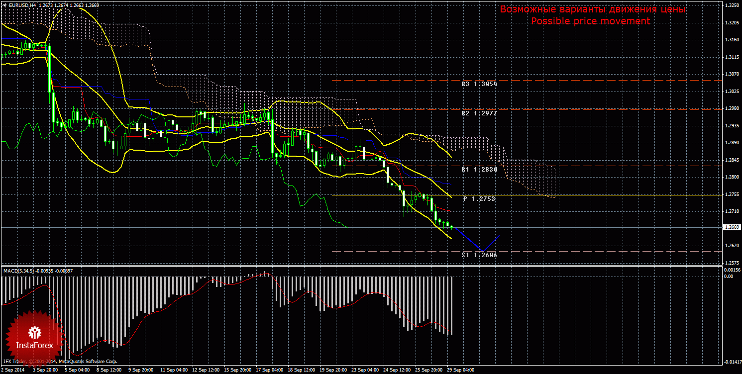 Анализ рынка Форекс по евро за 29 сентября показывает, что цена возобновила нисходящий тренд; индикатор MACD вновь развернулся вниз. Текущий сигнал на продажу подтвержденный и сильный, так как Чинкоу Спан находится ниже графика цены, а цена располагается ниже облака Ишимоку. На данный момент целью нисходящего движения является первый уровень поддержки 1,2606. В случае закрепления цены ниже первого таргета, нисходящее движение может продолжиться с целью второй уровень поддержки 1,2529. Нисходящее движение будет актуальным до тех пор, пока цена находится ниже Киджун-сен(1,2780), если цена закрепится выше критической линии, то сигнал на продажу будет ослаблен и может отмениться, а дальнейшее нисходящее движение будет поставлено под вопрос, восходящее движение может попытаться продолжиться с целью верхняя граница облака Ишимоку, а шорты потеряют свою актуальность. Чинкоу Спан находится ниже графика цены, что является подтверждением текущего сигнала на продажу и означает "медвежье" настроение трейдеров. Боллинджер Бандс показывает нисходящее движение, полосы расширяются и направлены вниз, поэтому сейчас актуальны короткие позиции на рынке. MACD развернулся вниз, что свидетельствует о текущем нисходящем движении, разворот индикатора вверх может просигнализировать о новом витке восходящей коррекции. Отскок цены от уровня 1,2606 также может спровоцировать виток коррекционного движения.
