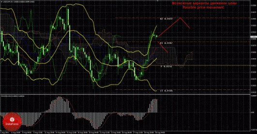 Анализируя курс иены на рынке Форекс 30 августа, видно, что цена сформировала сигнал на покупку, но выше облака Ишимоку закрепиться с первой попытки не смогла. Текущий сигнал на покупку является не подтвержденным и слабым, так как Чинкоу Спан находится ниже графика цены, а цена располагается внутри облака Ишимоку. Поэтому сейчас целью для восходящего движения является первый уровень сопротивления 99,63. В случае преодоления первого таргета, восходящее движение может продолжиться с целью – второй уровень сопротивления 100,51. Восходящее движение актуально до тех пор, пока цена находится выше критической линии Киджун-сен (97,80), если цена закрепится ниже Киджун-сен, то «золотой крест» ослабится и может отмениться, а дальнейшее восходящее движение поставится под сомнение, в этом случае может попытаться возобновиться нисходящее движение с целью первый уровень поддержки 97,39. Чинкоу Спан находится ниже графика цены, что не является подтверждением текущему сигналу на покупку и означает медвежье настроение участников рынка по валютной паре доллар/иена. Боллинджер Бандс показывает продолжение нисходящего(!) движения, полосы направлены вниз и немного сужаются, поэтому сейчас на рынке рекомендуется рассматривать варианты коротких позиций, что противоречит слабому «золотому кресту». MACD направлен вверх, что говорит о текущем восходящем движении, разворот индикатора вниз может просигнализировать о возможном начале нисходящей коррекции. Отскок от критической линии или Сенкоу Спан Б может спровоцировать возобновление восходящего движения.