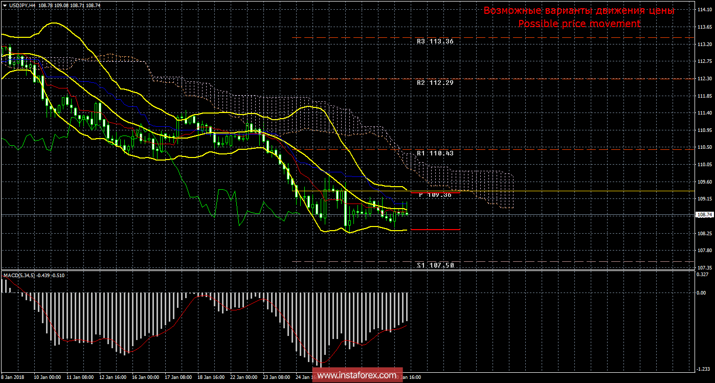 В отличие от валютных пар EUR/USD и GBP/USD, USD/CHF, похоже, перешла к откровенному боковому движению. Несмотря на высокую волатильность инструмента, ярко выраженного трендового движения сейчас нет. Индекс ведущих экономических индикаторов KOF Швейцарии оказался ниже, чем ожидалось. Выступление Дональда Трампа сегодня ночью было нейтральным. В нем президент США подводил итоги своего первого года правления и не делал акцент на монетарной политике. Индикатор потребительской уверенности в США также не смог сдвинуть инструмент с «мертвой» точки. Также следует отметить, что цена продолжает располагаться около достигнутых еще на прошлой неделе минимумов. То есть коррекции как таковой в сторону американской валюты не было. Это говорит о том, что многие трейдеры не верят сейчас в доллар США и/или ждут каких-либо важных событий или выступлений в Штатах, например, сегодняшних результатов заседания ФРС, последнего заседания во главе с Джанет Йеллен. Ключевая ставка, скорее всего, останется без изменений, но, возможно, сопроводительное письмо будет содержать что-либо важное и интересное. «Мертвый крест» пока что остается в силе, но если флэт продолжится, то Ишимоку может начать формировать ложные сигналы. Для возможности открытия новых позиций рекомендуется дождаться возобновления трендового движения, о чем просигнализируют полосы Боллинджера расширением в одну из сторон. Средняя волатильность по инструменту составляет сейчас около 115 пунктов в день.