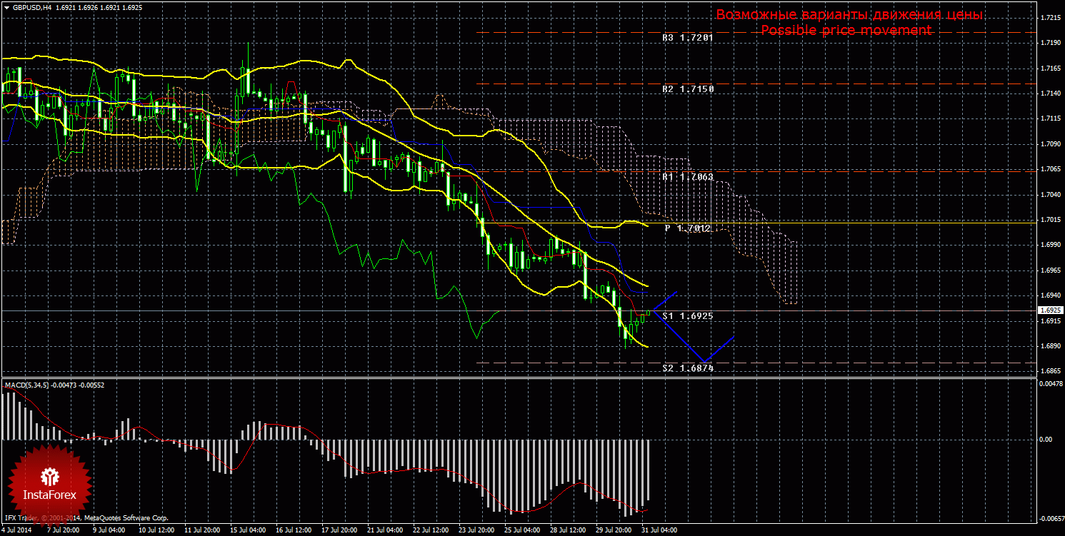 Валютный курс фунта 31 июля начал восходящее коррекционное движение, о чем просигнализировал разворот индикатора MACD наверх. Текущий сигнал на продажу – подтвержденный и сильный, так как Чинкоу Спан закрепился ниже графика цены, а цена располагается ниже облака Ишимоку. На данный момент целью нисходящего движения является первый уровень поддержки 1,6925. В случае преодоления этого таргета, нисходящее движение может продолжиться с целью второй уровень поддержки 1,6874. Нисходящее движение сохраняется до тех пор, пока цена находится ниже Киджун-сен(1,6945), если цена закрепится выше критической линии, то сигнал на продажу будет ослаблен и поставлен на грань отмены, шорты потеряют свою актуальность, а восходящее движение может попытаться продолжиться с целью пивот уровень 1,7012. Чинкоу Спан находится ниже графика цены, что является подтверждением текущему сигналу на продажу и означает медвежье настроение валютных трейдеров по этой валютной паре. Боллинджер Бандс показывает продолжение нисходящего движения, полосы расширяются и направлены вниз, поэтому сейчас на рынке актуальны короткие позиции. MACD развернулся наверх, что сигнализирует сейчас о текущем восходящем движении цены, если индикатор развернется вниз, это может засвидетельствовать завершение коррекционного движения. Отскок цены от Киджун-сен также может спровоцировать завершение витка восходящей коррекции.