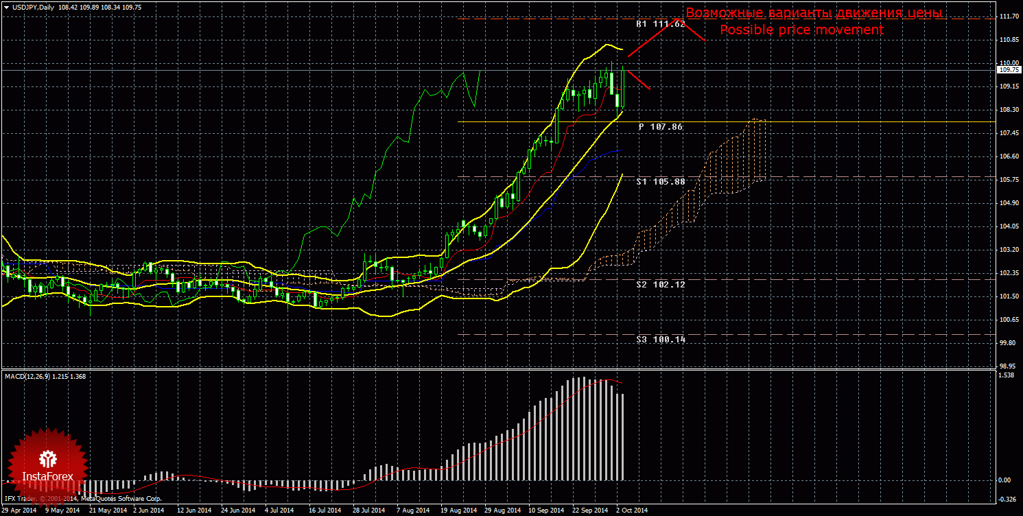 Цена иены на прошедшей неделе начала корректироваться, о чем просигнализировал разворот индикатора MACD вниз. Текущий сигнал на покупку является подтвержденным и сильным, так как Чинкоу Спан находится выше графика цены, а цена в свою очередь располагается выше облака Ишимоку. Целью для торговли на повышение выступает первый уровень сопротивления 111,62. При преодолении ценой первого таргета, новой целью для восходящего движения будет выступать второй уровень сопротивления 113,60. Восходящее движение будет актуальным до тех пор, пока цена находится выше Киджун-сен (106,80), если цена закрепится ниже критической линии, то продолжение восходящего движения будет поставлено под вопрос, а нисходящее движение может попытаться продолжиться с целью нижняя граница облака Ишимоку, сигнал на покупку будет ослаблен, а длинные позиции станут не актуальными. Цена находится выше линий Тенкан-сен и Киджун-сен, что указывает на текущее восходящее движение. Тенкан-сен развернулся вниз, что говорит нам о нисходящем движении в краткосрочном плане. Киджун-сен направлен вверх, что свидетельствует о том, что восходящее движение продолжается в более долгосрочном плане. Чинкоу Спан находится выше графика цены, что является подтверждением текущего сигнала на покупку и означает "бычье" настроение трейдеров. Облако Ишимоку направлено вверх и немного сужается, что свидетельствует о восходящем уклоне движения и о его ослаблении. Если цена отскочит от критической линии, это может засвидетельствовать возобновление восходящего движения.