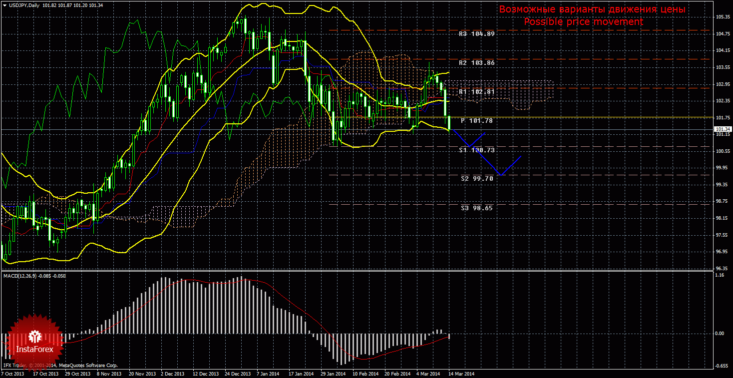 По иене на прошедшей неделе цена продолжила отрабатывать «золотой крест», но закрепилась ниже критической линии, поэтому нисходящее движение может продолжиться. Текущий сигнал на покупку является не подтвержденным и слабым, так как Чинкоу Спан закрепился ниже графика цены, а цена в свою очередь располагается ниже облака Ишимоку. Первой целью нисходящего движения выступает первый уровень поддержки 100,73. Если цена преодолеет первый таргет, то новой актуальной целью будет выступать второй уровень поддержки 99,70. Нисходящее движение будет актуальным до тех пор, пока цена находится ниже Киджун-сен(102,50), если цена закрепится выше критической линии, то восходящее движение может попытаться возобновиться с целью второй уровень сопротивления 103,86. Цена находится ниже линий Тенкан-сен и Киджун-сен, что указывает на текущее нисходящее движение. Тенкан-сен направлен вверх, что говорит нам о восходящем движении в краткосрочном плане. Киджун-сен также направлен вверх, что свидетельствует о том, что восходящее движение продолжается и в более долгосрочном плане. Но обе линии уже в ближайшее время могут развернуться вниз, также может сформироваться новый сигнал на продажу. Чинкоу Спан находится ниже графика цены, что не является подтверждением текущему сигналу на покупку и означает медвежье настроение трейдеров. Облако Ишимоку направлено вниз и сужается, что свидетельствует о нисходящем уклоне движения и о его ослаблении. Отскок цены от уровня 100,73 может спровоцировать виток восходящей коррекции.