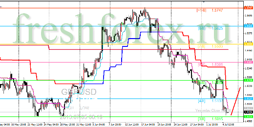 Четырехчасовой график GBPUSD. На данный момент сложились очень серьезные предпосылки бокового движения в канале (3/8 - 5/8). После отскока от уровня 1.5259 (5/8) последовал пробой главного уровня поддержки/сопротивления 1.5137 (4/8), и сейчас цена подошла к его нижней границе 1.5015(3/8). Здесь можно ожидать разворот вверх и затем начало бокового движения между уровнями (3/8) и (5/8).