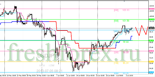Четырехчасовой график пары USD/JPY. После преодоления уровня 100.00(4/8) вверх, цена снизилась и пробила этот уровень в обратную сторону, однако это не меняет сложившейся ситуации. Уровень 100.00(4/8) это самый сильный уровень в системе оказывающий существенное влияние на цену, но он теряет свои свойства когда цена движется в канала ( 3/8 – 5/8), мы ждем подтверждения этого варианта. Оно будет заключается в отскоке от границы канала, если отскок произойдет, в ближайшее время цена проведет в горизонтальном движении.